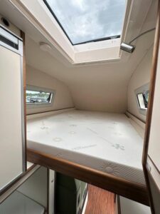 Profitant d’une rehausse qui le fait culminer à 3,14m, le Cosmo propose un grand lit escamotable sous plafond (200 x 160 cm) à l’avant. Assisté par des vérins et articulé par des charnières, le lit bascule jusqu’à prendre appui sur les meubles disposés de part et d’autres de l’habitacle. Grâce à la hauteur du véhicule, l’utilisation du salon n’est pas condamné par le déploiement du lit de pavillon. Un excellent point.