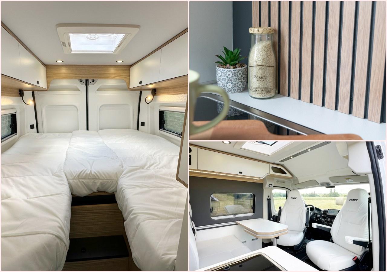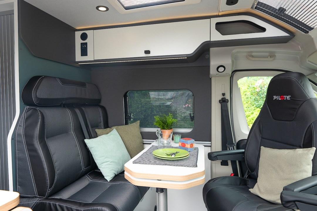 Marque généraliste, Pilote associe les fourgons à la refonte générale de ses camping-cars. Identifié sous le nom de Pyla, ce nouveau style marie les courbes et les formes plus géométriques et ajoute des éléments graphiques (panneau en claire-voie côté cuisine) et contrastés (encadrement intérieur de la fenêtre).