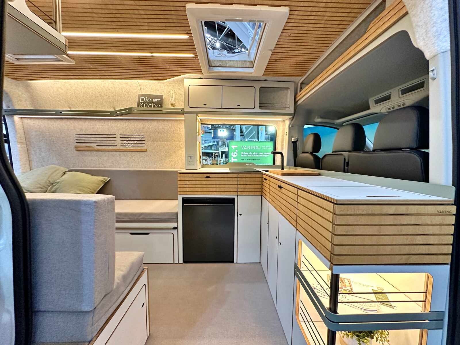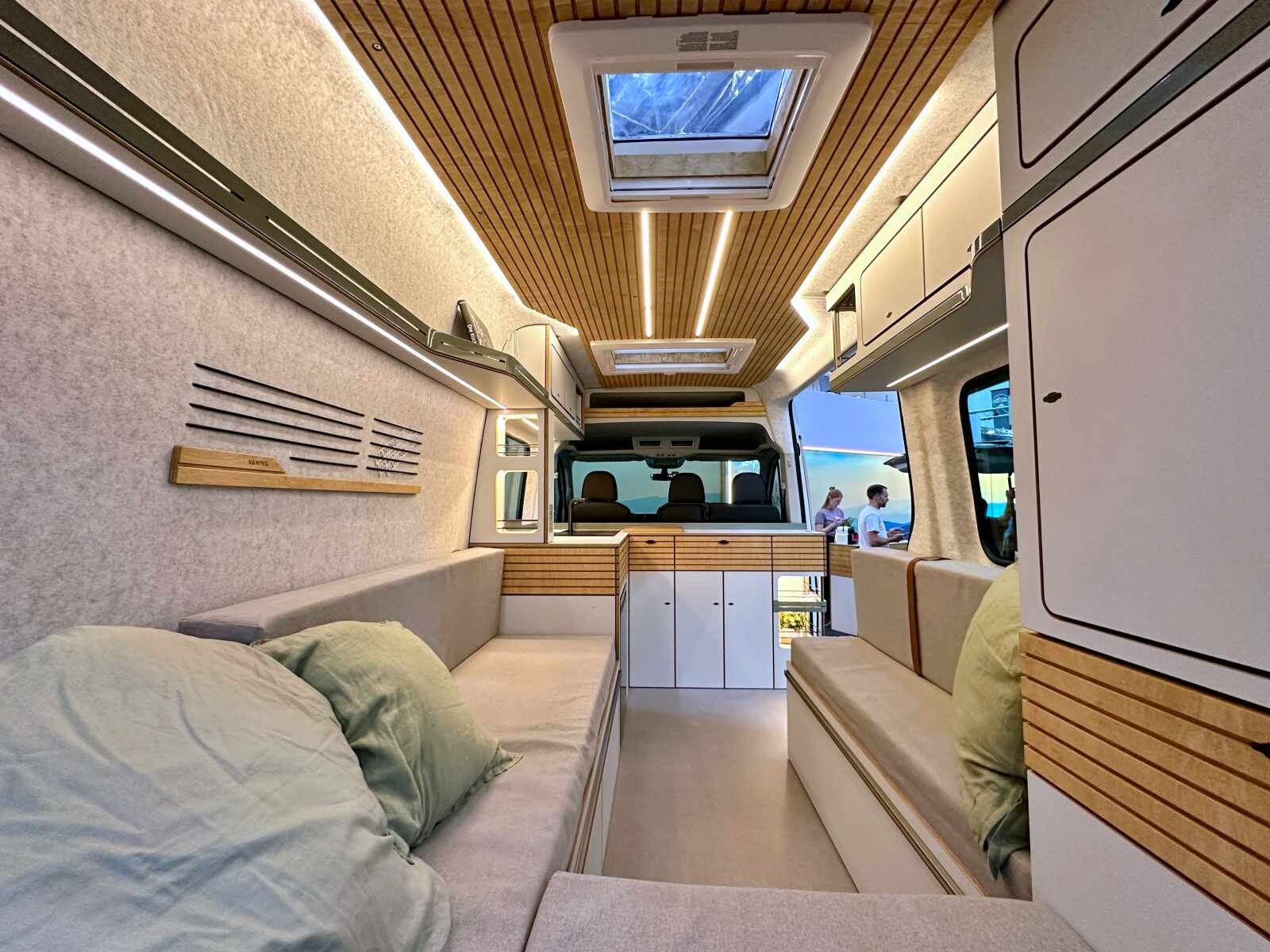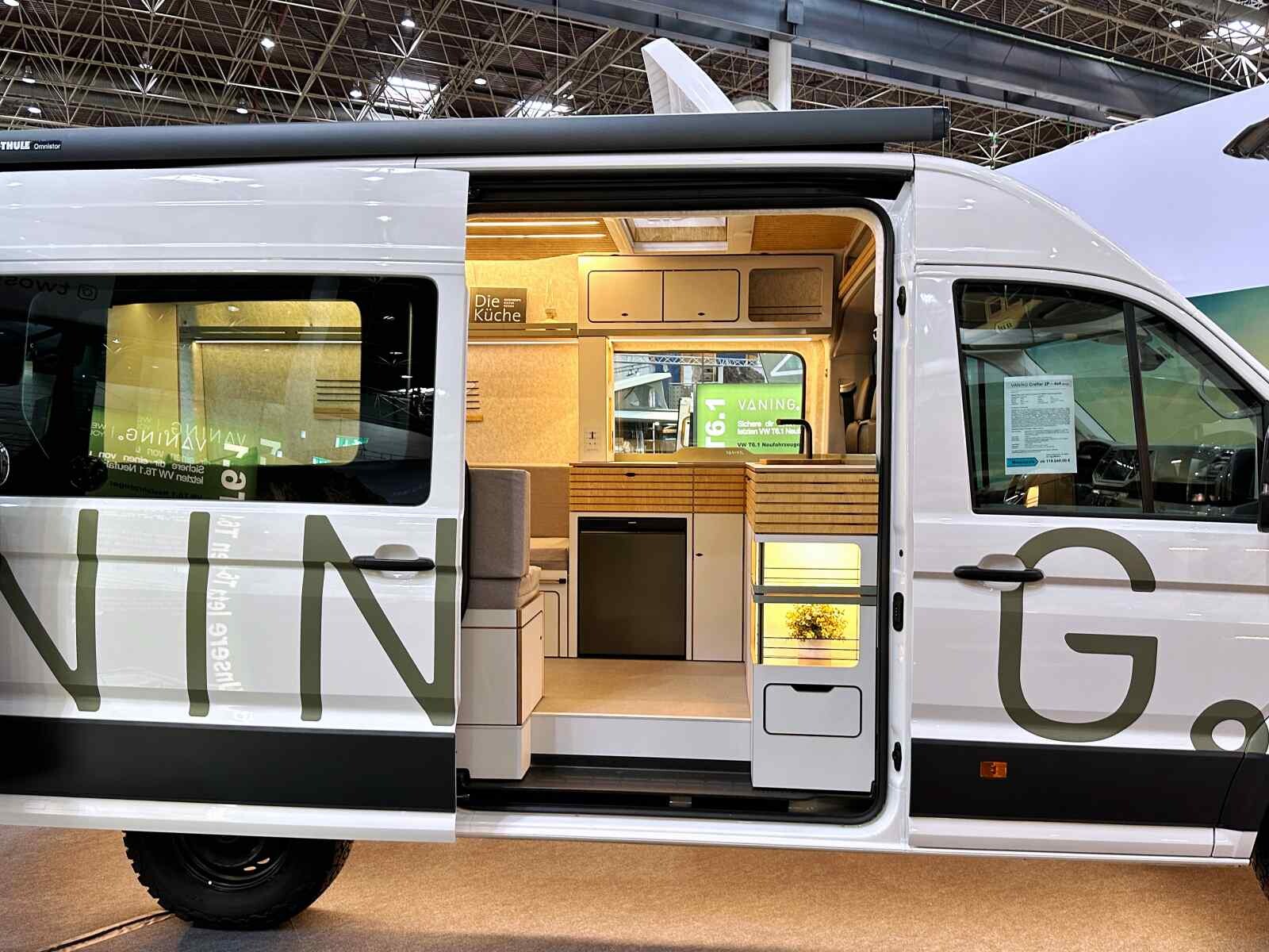 L’aventure oui, mais avec style et confort avant tout. Tel pourrait être le crédo de l’aménageur allemand Vaning (ex-Bullifaktur) et de ses deux fondateurs, Dennis Sawadsky, ingénieur, et Aaron Rauh, designer industriel. Spécialiste du van à toit relevable, la société de 25 salariés a depuis peu répondu aux demandes de véhicules plus grands. Le résultat est visible sur leur stand du Caravan Salon, où trône un VW Crafter de 5,99 m à l’ambiance intérieure très séduisante. L’esthétique générale le dispute à l’aménagement fonctionnel. Sans accès intérieur à la cabine et sans salle d’eau, le Crafter 2P est conçu tout autour de l’habitacle avec une partie centrale agréablement dégagée.