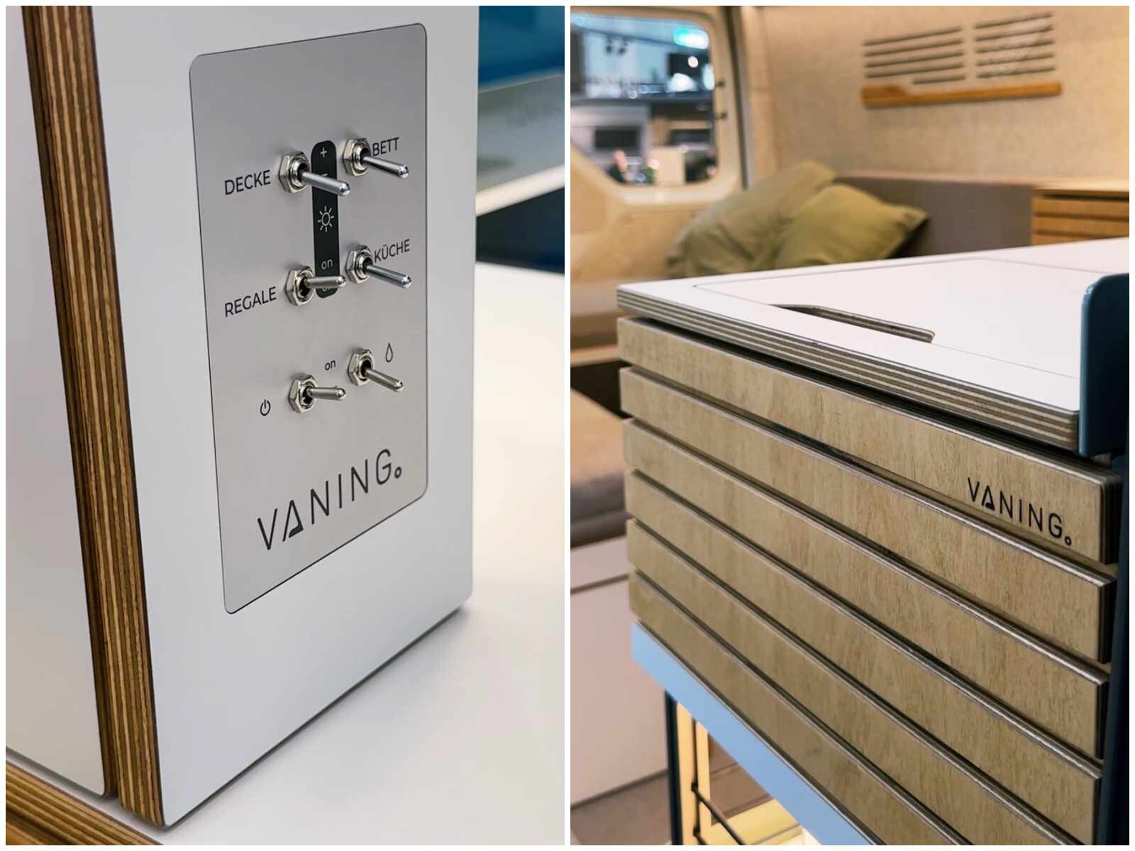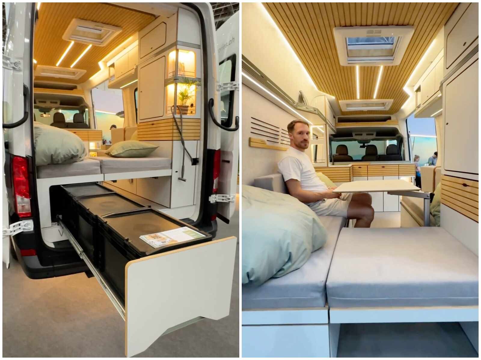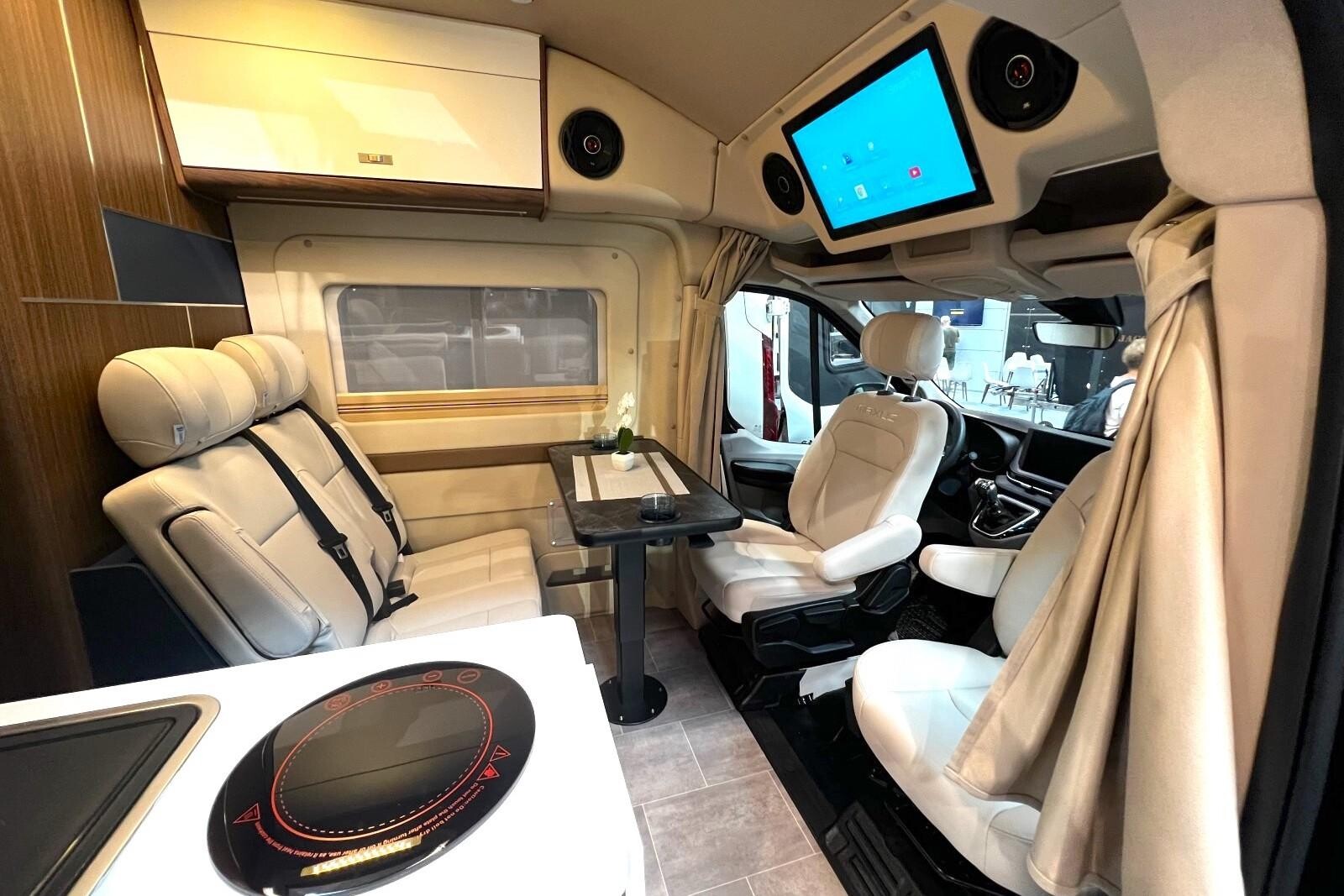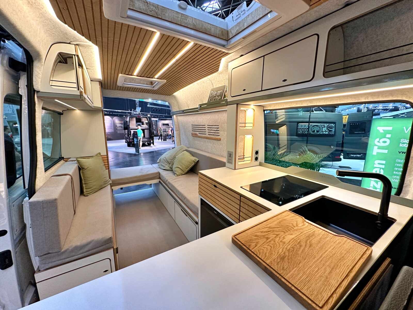 L’aventure oui, mais avec style et confort avant tout. Tel pourrait être le crédo de l’aménageur allemand Vaning (ex-Bullifaktur) et de ses deux fondateurs, Dennis Sawadsky, ingénieur, et Aaron Rauh, designer industriel. Spécialiste du van à toit relevable, la société de 25 salariés a depuis peu répondu aux demandes de véhicules plus grands. Le résultat est visible sur leur stand du Caravan Salon, où trône un VW Crafter de 5,99 m à l’ambiance intérieure très séduisante. L’esthétique générale le dispute à l’aménagement fonctionnel. Sans accès intérieur à la cabine et sans salle d’eau, le Crafter 2P est conçu tout autour de l’habitacle avec une partie centrale agréablement dégagée.