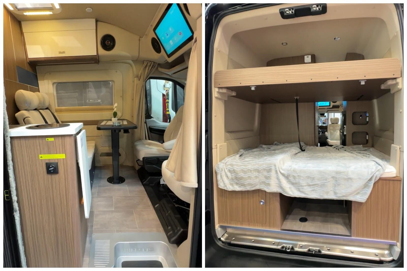 L’aménageur franco-allemand revoit du sol au plafond son camper-van sur MAN TGE. Le Sven Hedin conserve son ingénieuse extension « pop-out » électrique, lui permettant d’offrir un grand couchage dans la largeur à l’arrière. Mais il voit son ambiance intérieure (mobilier aux décors blanc/bois + sol façon pont de bateau) et sa centrale de commande (modèle Dometic/Westfalia avec écran tactile 4,3’’) renouvelées. Ces éléments sont directement repris de la gamme Columbus.