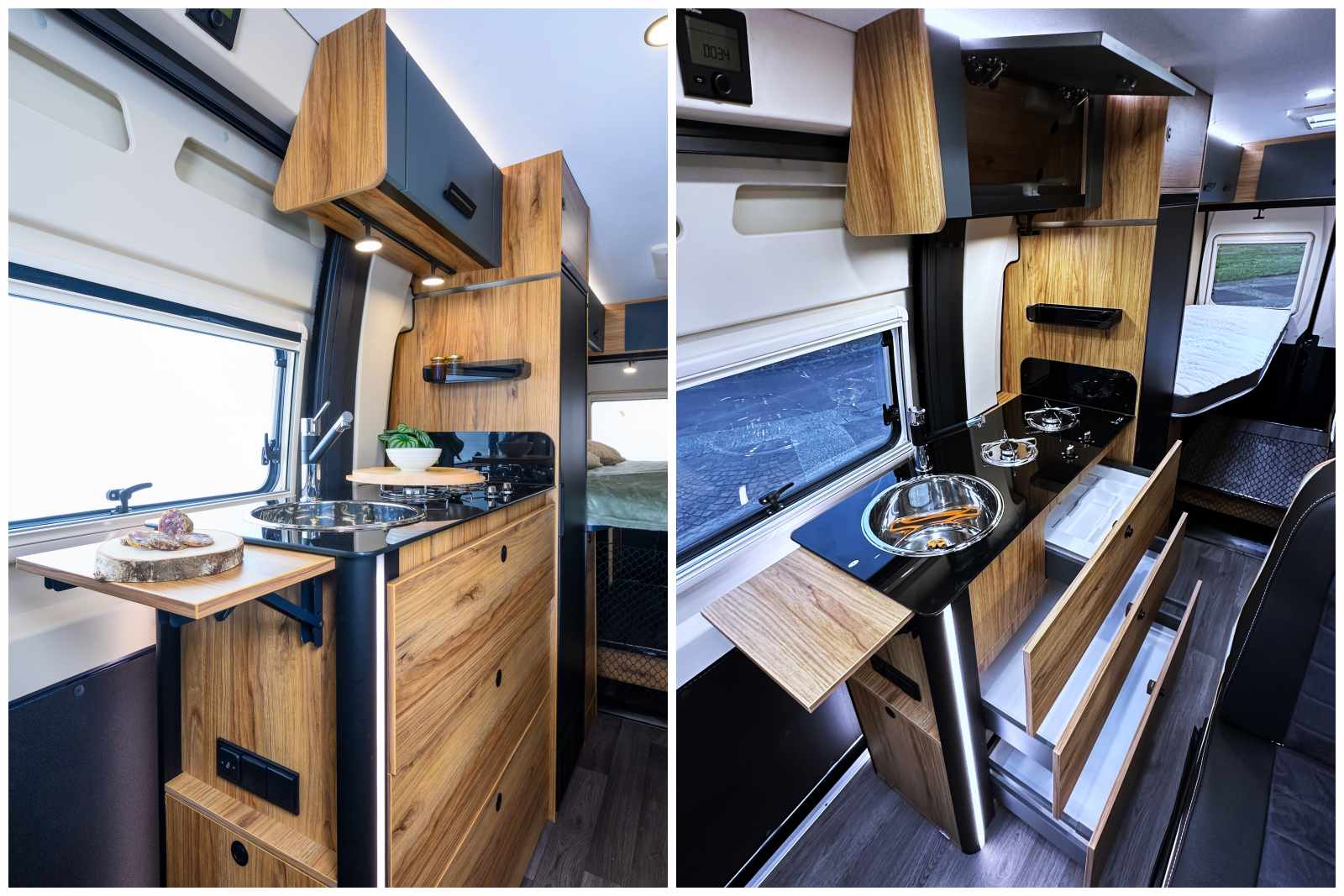 Compact avec seulement 5,41 m de long, le Rando Camp est le plus maniable des fourgons aménagés. Son agencement bien équilibré a tout pour plaire, un lit permanent sur sommier à lattes (194 x 133/107 cm), un cabinet de toilette avec douche, WC et lavabo escamotable, une banquette face route associée au sièges cabine pour la dinette. Enfin, une cuisine avec frigo 70 L à double sens d’ouverture en bout de meuble.