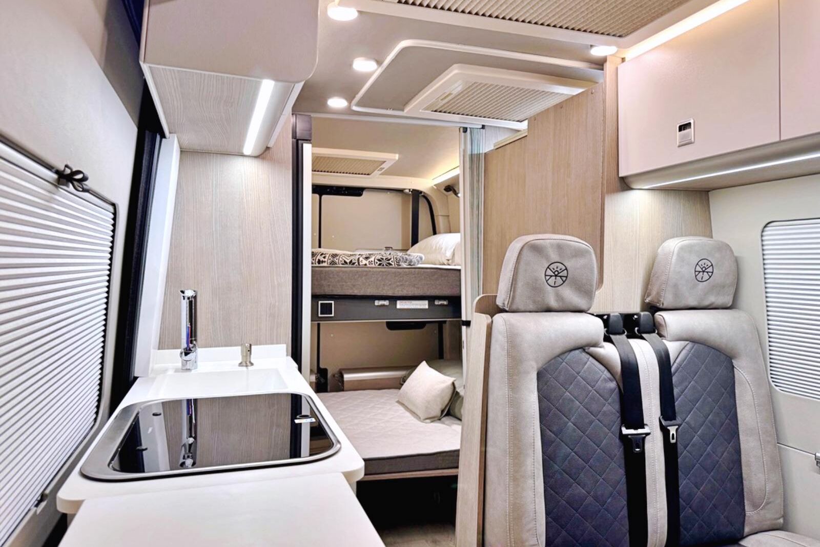 Même philosophie pour les couchages arrière qui n’encombrent pas l’espace en permanence et sont relégués au plafond, libérant le volume de la soute pour le transport des affaires et la circulation. La nuit il suffit d’abaisser électriquement le lit du haut (131 x 196 cm) à la hauteur souhaitée. Tandis que le lit du bas (122 x 196 cm) vient reposer sur les coffres latéraux de la soute, où sont hébergés les réservoirs d’eaux (125 L propres, 74 L usées), le chauffage Webasto sur Diesel, et le coffre à gaz pour bouteille 2,75 kg.