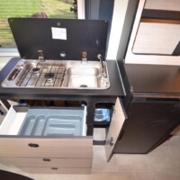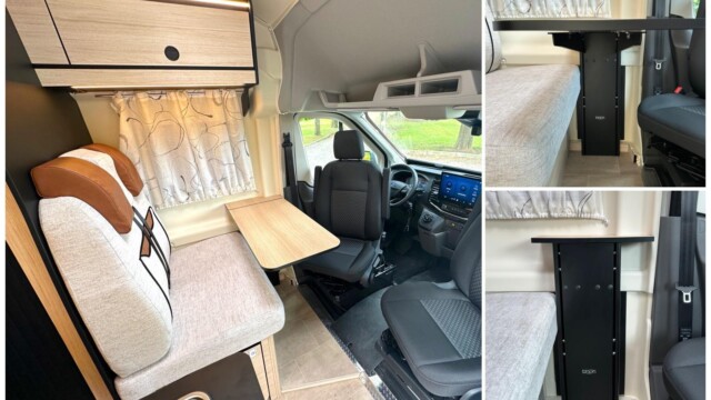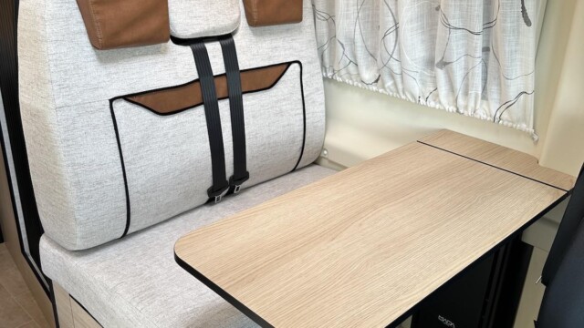 Détail pratique qui attire l’attention : la table du salon ne prend appui sur aucun pied ! Elle est directement fixée sur la cloison attenante à l’aide de crochets verrouillables. Astucieux, ce système évite de se cogner les jambes lorsque l’on se glisse sous le plateau. Si Rimor n’est pas le premier constructeur à développer ce type de table suspendue (voir notamment Pössl Summit 540 Shine, Knaus Boxdrive 600 XL & 680 ME, Laika Ecovip 600), la sienne a ceci de singulier qu’elle peut venir s’installer à l’extérieur, au dos du bloc cuisine. Là encore, c’est malin !