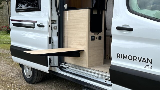 Sur la partie habitacle, Rimor ajoute un grand lanterneau au salon, des occultants en cabine, un chauffage alimenté au gaz (diesel en option à 202 €) ou encore un marchepied électrique.