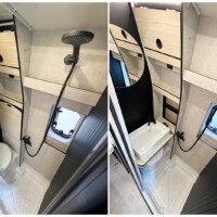 Compact, le bloc cuisine est prolongé par un meuble où s’encastre le réfrigérateur 90 L. À son bout, du côté de l’entrée, une tablette escamotable permet d’ajouter une petite surface de travail. En face, la salle d’eau 3-en-1 donne accès à deux espaces : au fond à gauche, le WC fixe au-dessus duquel on peut déplier un lavabo escamotable ; à l’entrée, une douche de bonnes dimensions. Un simple rideau souple assure ici la séparation des deux zones.