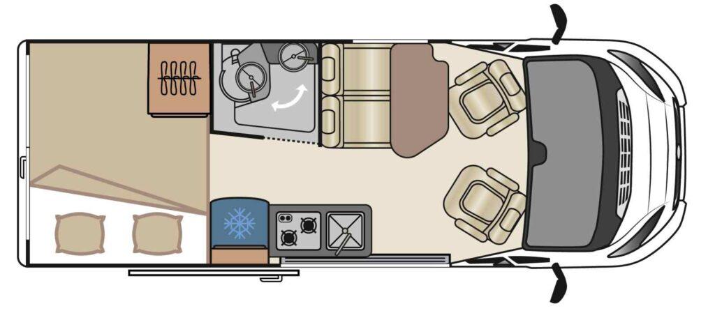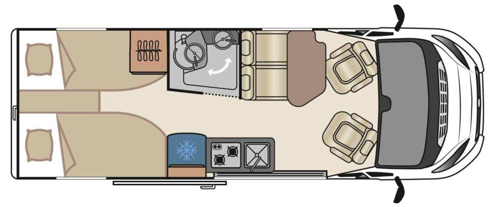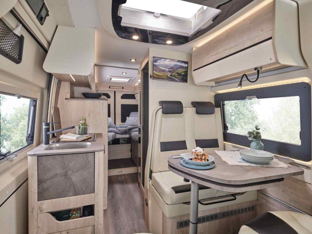 On retrouvera sur les « Black Pearl » des solutions plutôt rares, à l’image de la fenêtre de toit vitrée au-dessus de la cabine et la banquette réglable en profondeur, gage de confort à l’étape. A leur crédit, ajoutons le combiné Truma 4 Diesel, le grand frigo de 135 L et les habillages intérieur en ABS, dont les formes épousent au plus près les éléments de carrosserie.