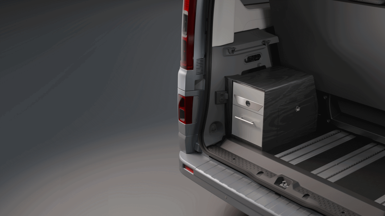 Comme le VW California Beach, le Renault Trafic Escapade dispose d’une cuisine minimaliste positionnée dans le coffre, réservée à un usage extérieur car seulement accessible par le hayon arrière. Photo © Renault