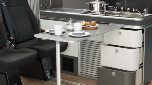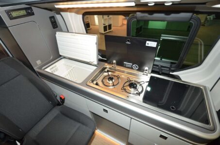 Rien de manque pour une utilisation loisirs, le meuble cuisine intègre un réfrigérateur à compression de 31 L, double réchaud à gaz, évier avec réserve de 27 L d’eau propre, et des espaces de rangements : 4 tiroirs, casserolier, ainsi qu’une table amovible. Le chauffage est assuré par un système à air Airtronic D3 Plus.