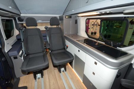 Développé sur NV300, clone du Renault Trafic, le Michelangelo présente un aménagement avec toit relevable, meuble cuisine et une série de quatre sièges individuels modulables sur des rails dans le plancher. Il s’inscrit dans la lignée des « monospaces de loisirs », ces nouveaux vans compacts et polyvalents, à l’image des récents Westfalia Kepler Six (lien) ou Campérêve Cap Coast (lien).