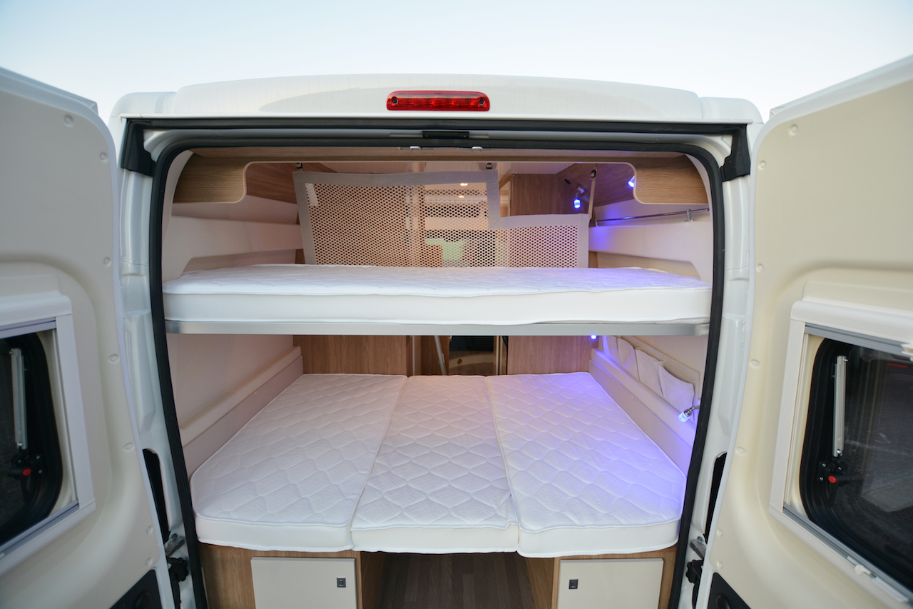L’italien RIMOR propose un aménagement sur Fiat Ducato de 5,99 m susceptible d’accueillir jusqu’à six personnes durant la nuit. Une prouesse permise par la superposition de deux lits doubles de même format (135 x 185 cm) à l’arrière et par le couchage d’appoint à l’avant.