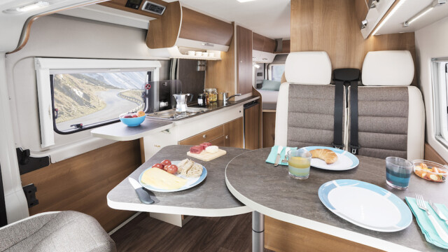 De tous les modèles VanTourer, notre préférence se porte sur le 540, qui, outre son format réduit de 5,41 m, peut disposer de six places nuit par addition de plusieurs couchages en option : chambre sous toit pop up (+3690€) + couchage bas transversal (+499€).