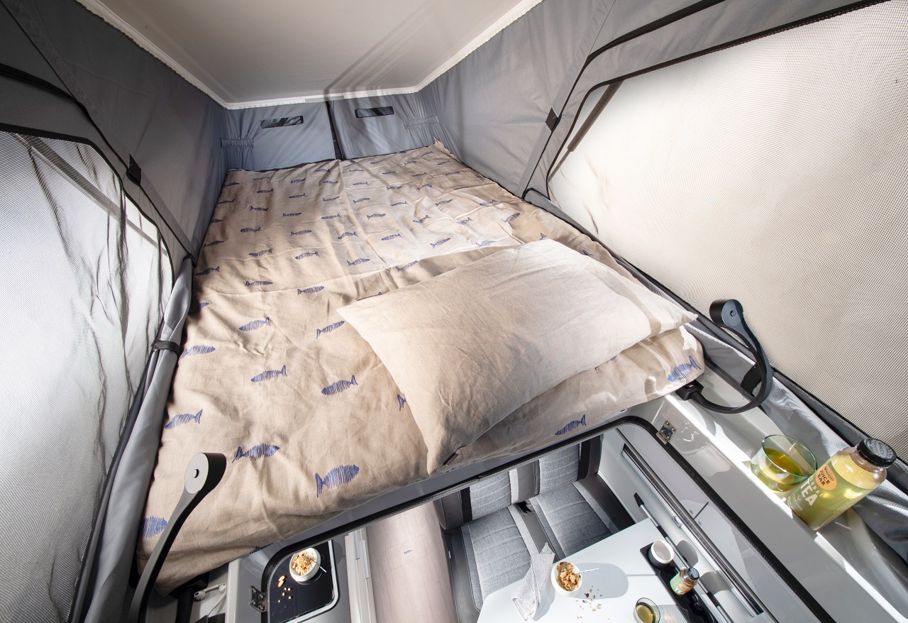 Pour la toile ceinturant la chambre haute, le constructeur slovène a retenu un tissu technique Sattler, répondant aux plus hautes exigences de longévité et résistance aux intempéries. Les deux moustiquaires latérales sont fixes, à l’inverse de celle à l’avant qui s’ouvre en grand. L’ensemble de la toile est totalement amovible en cas de nettoyage ou de réparation.