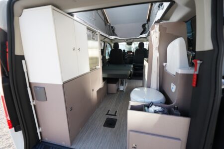 Dans le couloir, un receveur de douche amovible se connecte à travers le plancher à la cuve des eaux usées (50 L). Si l’idée de prendre une douche à l’intérieur du véhicule peut paraitre séduisante, elle induit tout de même le transport de l’encombrant bac à douche et l’épais rideau. Il sera plus facile de tirer la douchette vers l’extérieur, sous le hayon. Un kit eau chaude avec boiler électrique participe au confort.