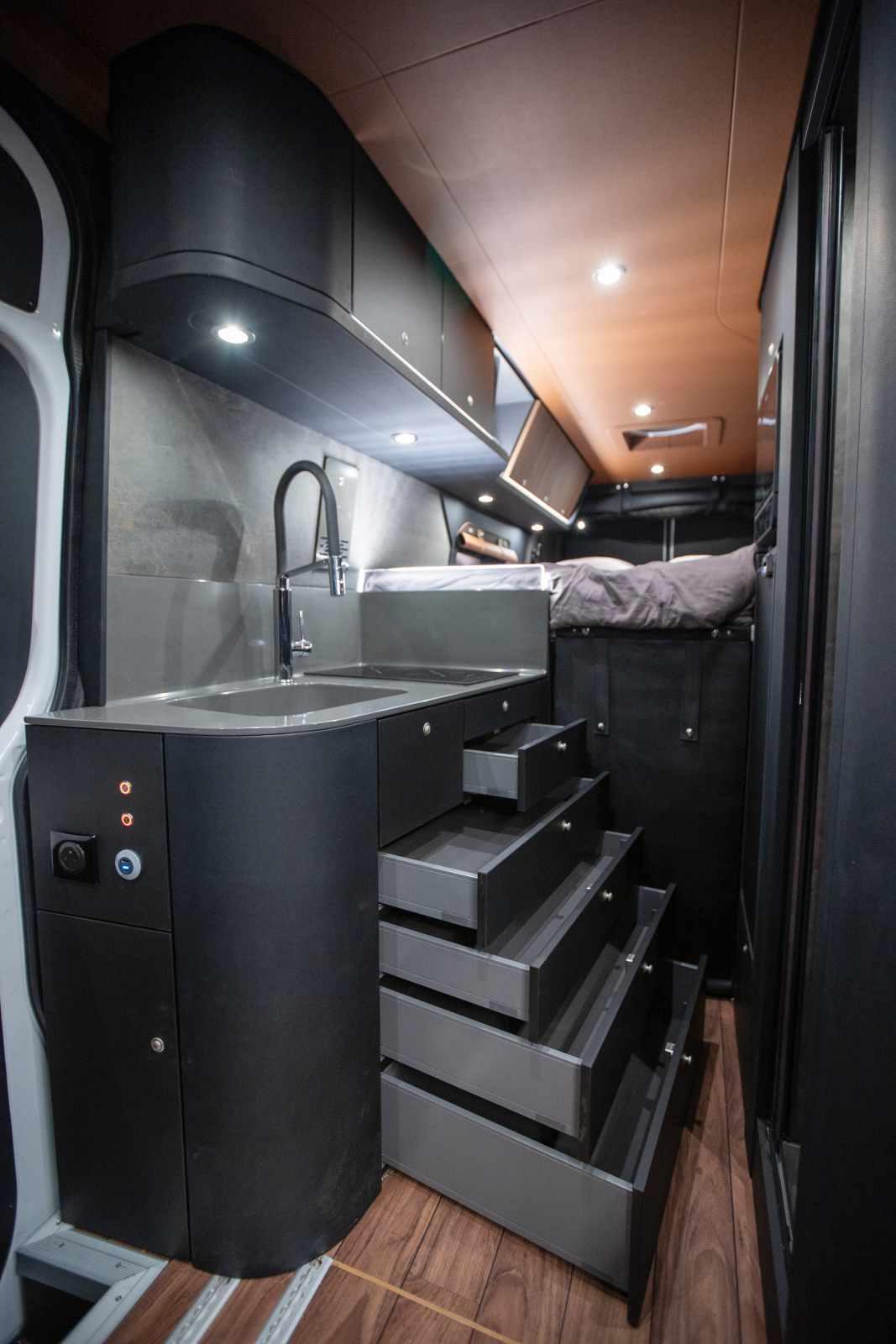 L’aménageur exploite parfaitement les dimensions du Mercedes, sans compromettre la circulation intérieure, généralement sacrifiée entre la cuisine et la salle d’eau. Au centre, une grande table ronde, autour de laquelle prennent place quatre convives à l’heure du repas. En configuration route, la table se replie pour partie et se transforme en tablette pour accompagner les voyageurs.