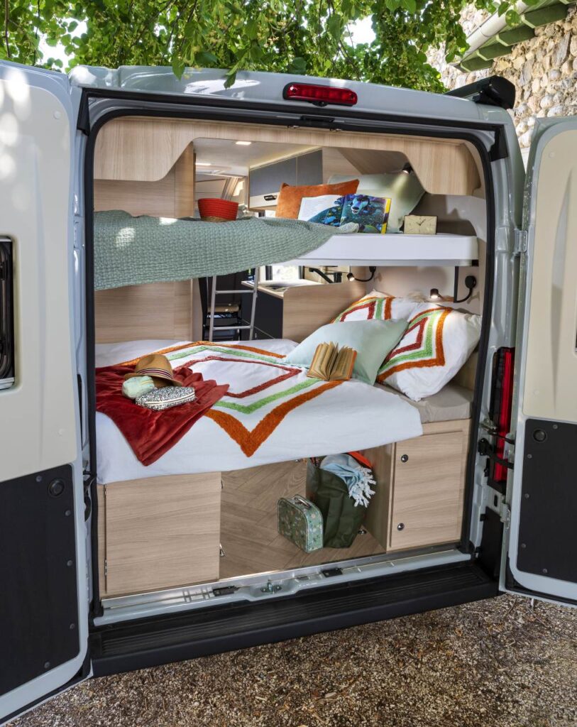 • Dimensions des couchages arrière : lit bas : 145 x 186 / couchette supérieure : 133 x 184 cm