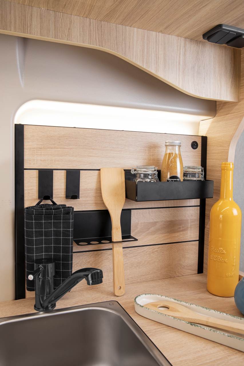 Engageant par palier une profonde refonte de ses aménagements, Challenger reprend sur le modèle Cosy Edition le bloc cuisine des fourgons BREAK EDITION (1er niveau) qui combine style et praticité avec un réfrigérateur à compression (84L) de grande capacité à l’avant du meuble. Pas de double charnière sur la porte, mais une ouverture à 180° qui permet tout de même un accès intérieur / extérieur. Pas de doute, la position du frigo améliore la perception du véhicule et participe au sentiment de bien-être, au même titre que la découpe du pavillon de cabine ou l’élargissement du couloir central opéré l’an dernier. On perd peut-être les grands tiroirs et l’extension du plan de travail, mais on gagne en circulation et en rangement dans le placard de pavillon.
