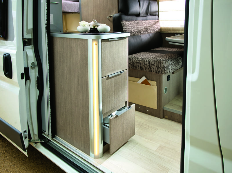 Autre changement notable : le meuble cuisine, beaucoup plus élaboré et fonctionnel sur la version Exclusive. Outre les éclairages intégrés et les abattants en verre, l’ouverture des tiroirs s’effectue sur le côté, ce qui permet d’accroître leur profondeur.
