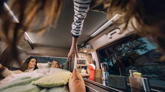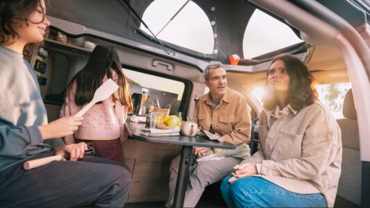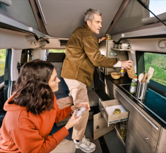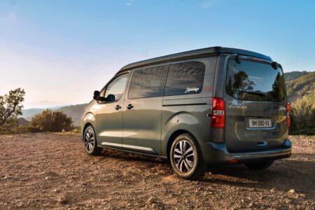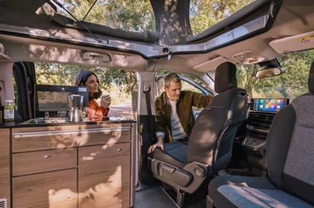 Avec un nom qui invite aux vacances, le Holidays mise sur sa grande polyvalence et sa capacité à se transformer en un tournemain : d’un véhicule de transport quotidien, à un petit camping-car prêt à partir en escapades familiales. Derrière ses deux portes latérales coulissantes, il propose quatre places route et quatre couchages, grâce à une banquette-lit convertible sur rails et un toit relevable intégrant un second lit. À bord, l’essentiel est là : meuble latéral, kitchenette avec réfrigérateur, réserves d’eau, table escamotable et batterie auxiliaire pour l’autonomie.