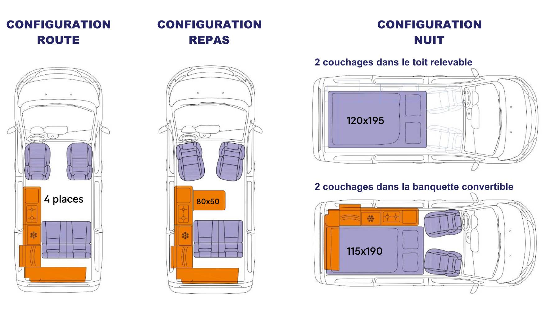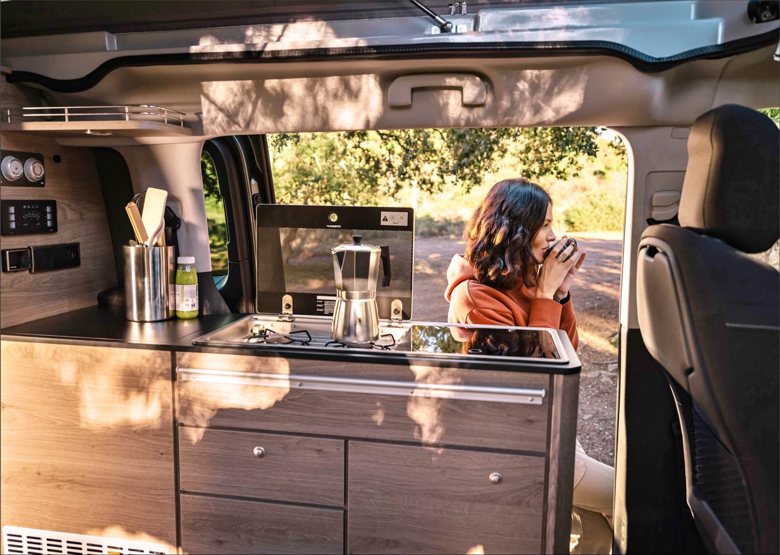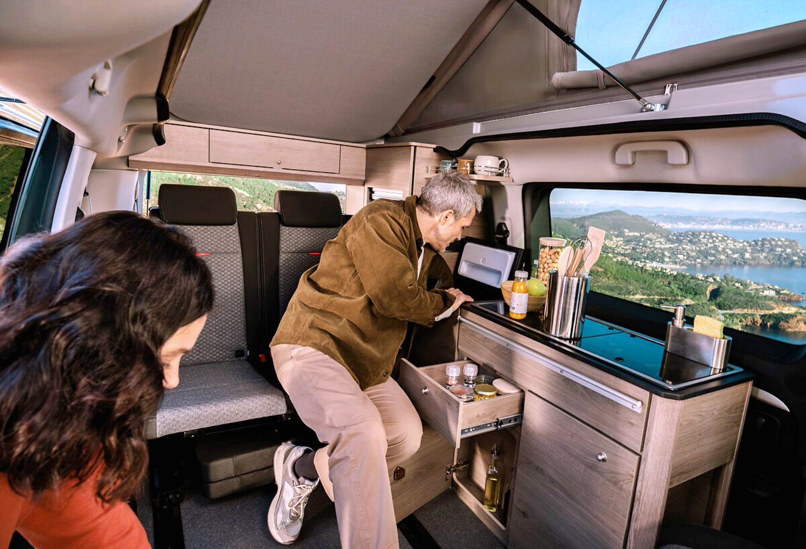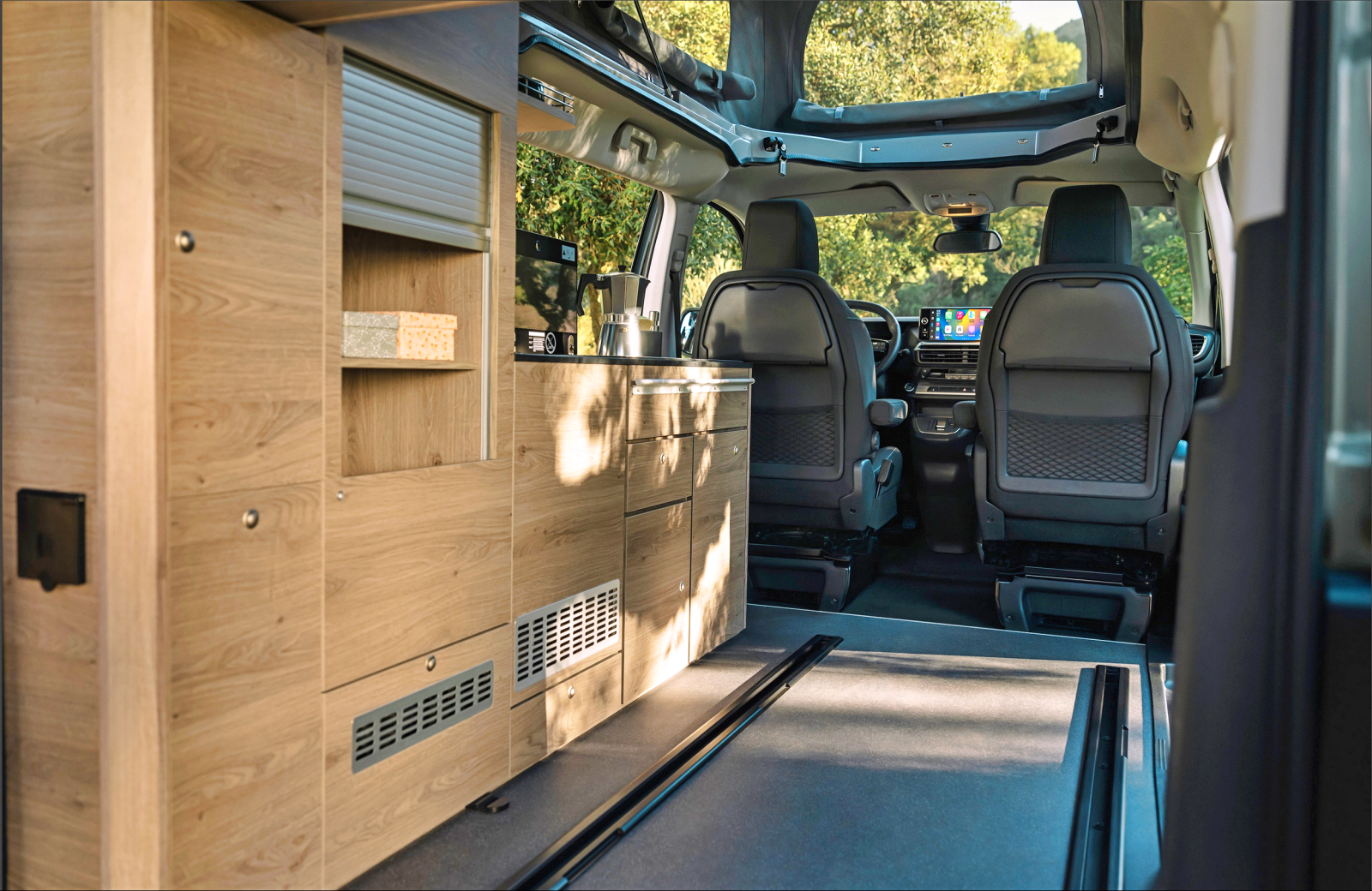 Avec un nom qui invite aux vacances, le Holidays mise sur sa grande polyvalence et sa capacité à se transformer en un tournemain : d’un véhicule de transport quotidien, à un petit camping-car prêt à partir en escapades familiales. Derrière ses deux portes latérales coulissantes, il propose quatre places route et quatre couchages, grâce à une banquette-lit convertible sur rails et un toit relevable intégrant un second lit. À bord, l’essentiel est là : meuble latéral, kitchenette avec réfrigérateur, réserves d’eau, table escamotable et batterie auxiliaire pour l’autonomie.