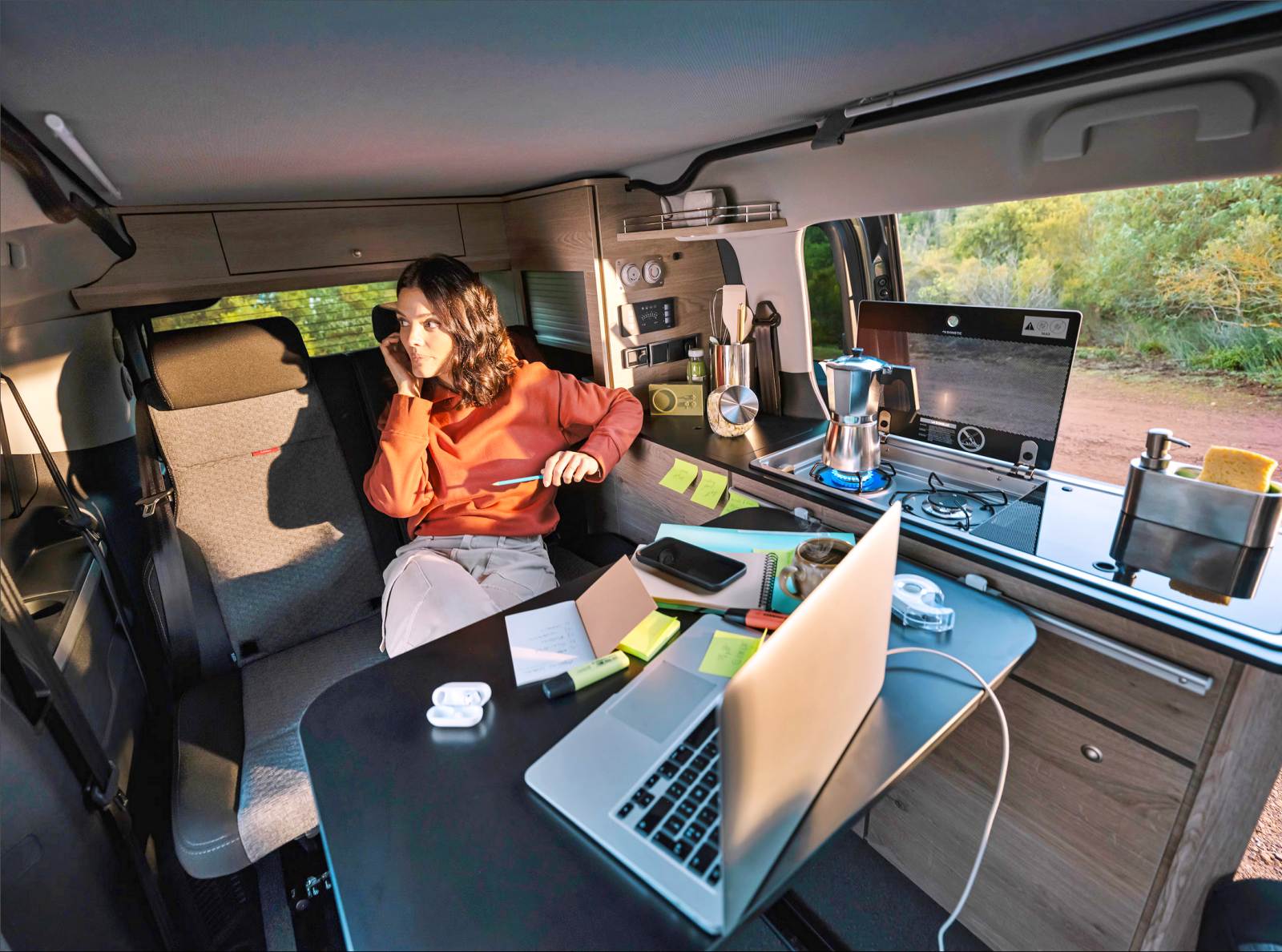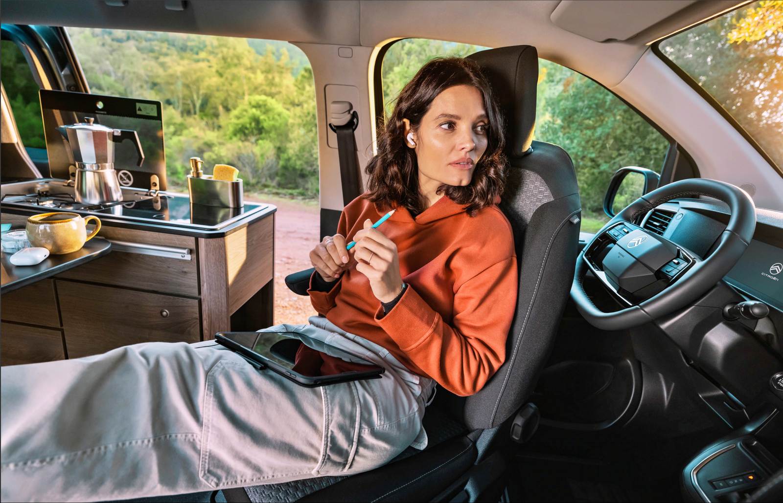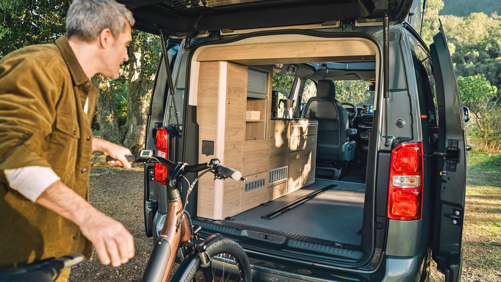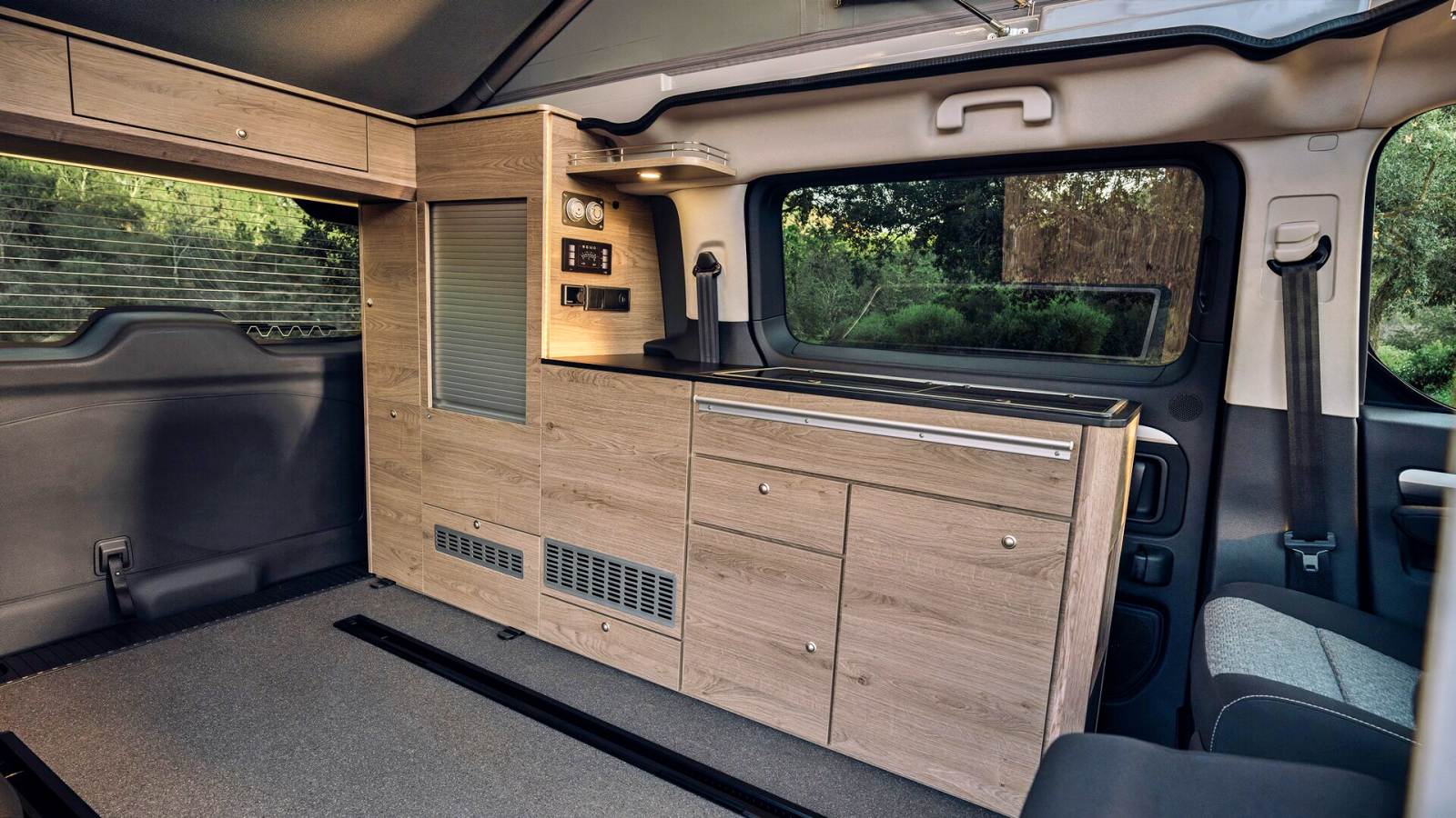 Avec un nom qui invite aux vacances, le Holidays mise sur sa grande polyvalence et sa capacité à se transformer en un tournemain : d’un véhicule de transport quotidien, à un petit camping-car prêt à partir en escapades familiales. Derrière ses deux portes latérales coulissantes, il propose quatre places route et quatre couchages, grâce à une banquette-lit convertible sur rails et un toit relevable intégrant un second lit. À bord, l’essentiel est là : meuble latéral, kitchenette avec réfrigérateur, réserves d’eau, table escamotable et batterie auxiliaire pour l’autonomie.