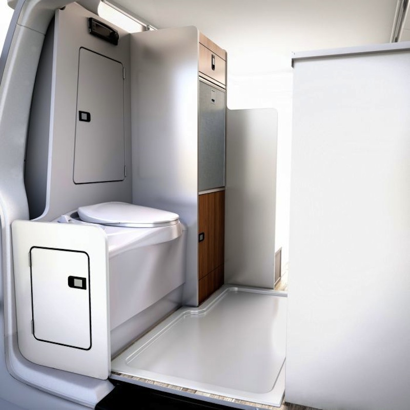Ce qui le démarque d’autres véhicules aussi compacts, c’est la possibilité d’avoir un WC intégré et une petite douche. Le chauffe-eau, le frigo compresseur et le chauffage sont des équipements de série.