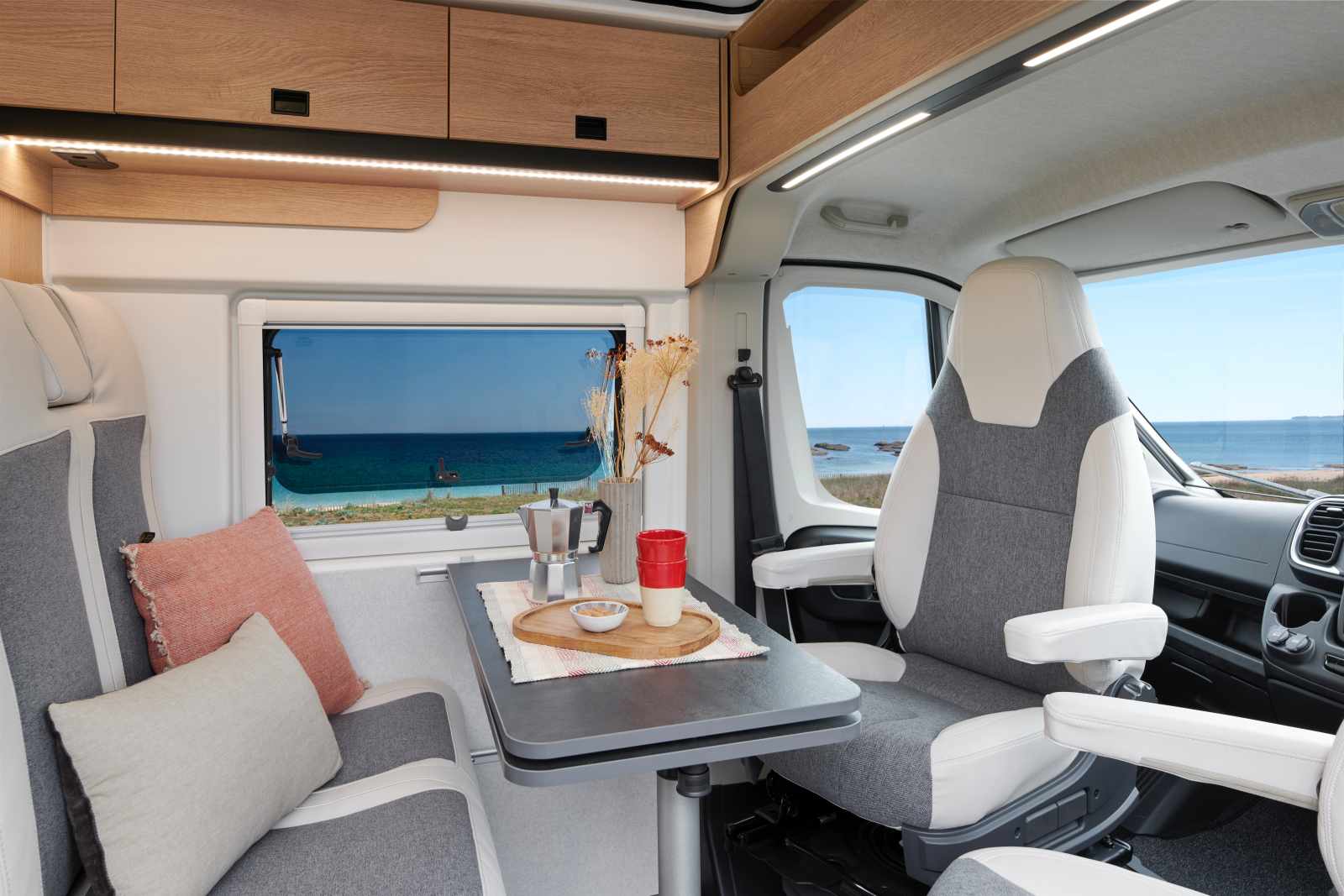 À l’intérieur, les fourgons Joa by Pilote conservent les fonctionnalités pratiques, très appréciées auparavant : profonds tiroirs et grands placards. En revanche, ce qui change, ce sont les couleurs nouvelles et le mobilier haut aux finitions élégantes. Parmi les bons points à retenir : le rétroéclairage qui améliore le style et le confort d’usage. Autres nouveautés, l’effort consenti sur la qualité des mousses d’assise en dînette, les housses bi-matières (simili-tissu) et l’intégration du système Isofix sur la banquette. Un préalable nécessaire quand on vise une clientèle familiale.