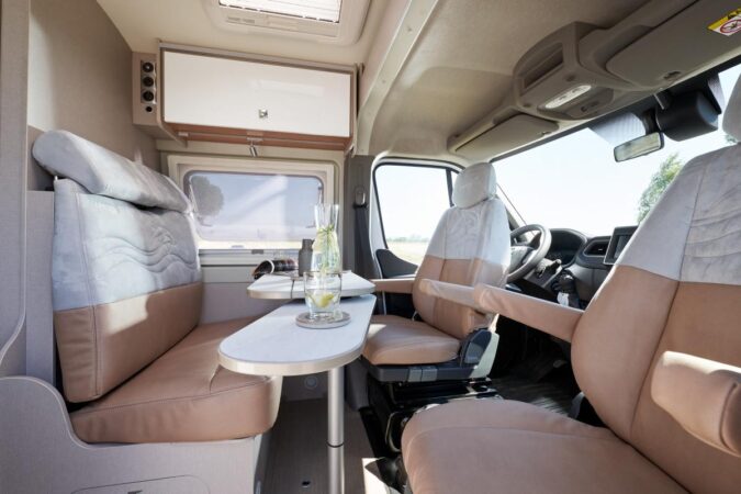 La dînette, plus spécifiquement, a fait l’objet d’une attention particulière. Pour favoriser un maximum de fonctionnalité, la table se veut peu encombrante et rabattable, ce qui permet de s’installer et de s’asseoir confortablement. La surface du plateau peut être augmentée à l’aide d’une rallonge. La banquette adopte des coussins d’assise ergonomiques et un dispositif Isofix. La transformation en couchage est optionnel.