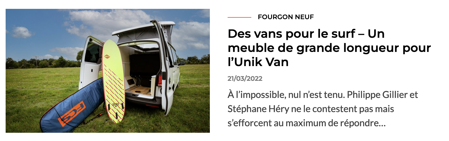 « Des modèles plus ou moins similaires, nous en faisons 5 ou 6 dans l’année, confie le dirigeant de Make My Van. Dans un esprit proche, nous avons réalisé récemment un aménagement pour la pratique du kitesurf (voir vidéo ci-dessous, NDLR). Nous pouvons décliner également le modèle sur un T6.1 court, mais il doit se contenter alors d’un logement pour les planches de 2,34m de long maximum. »
