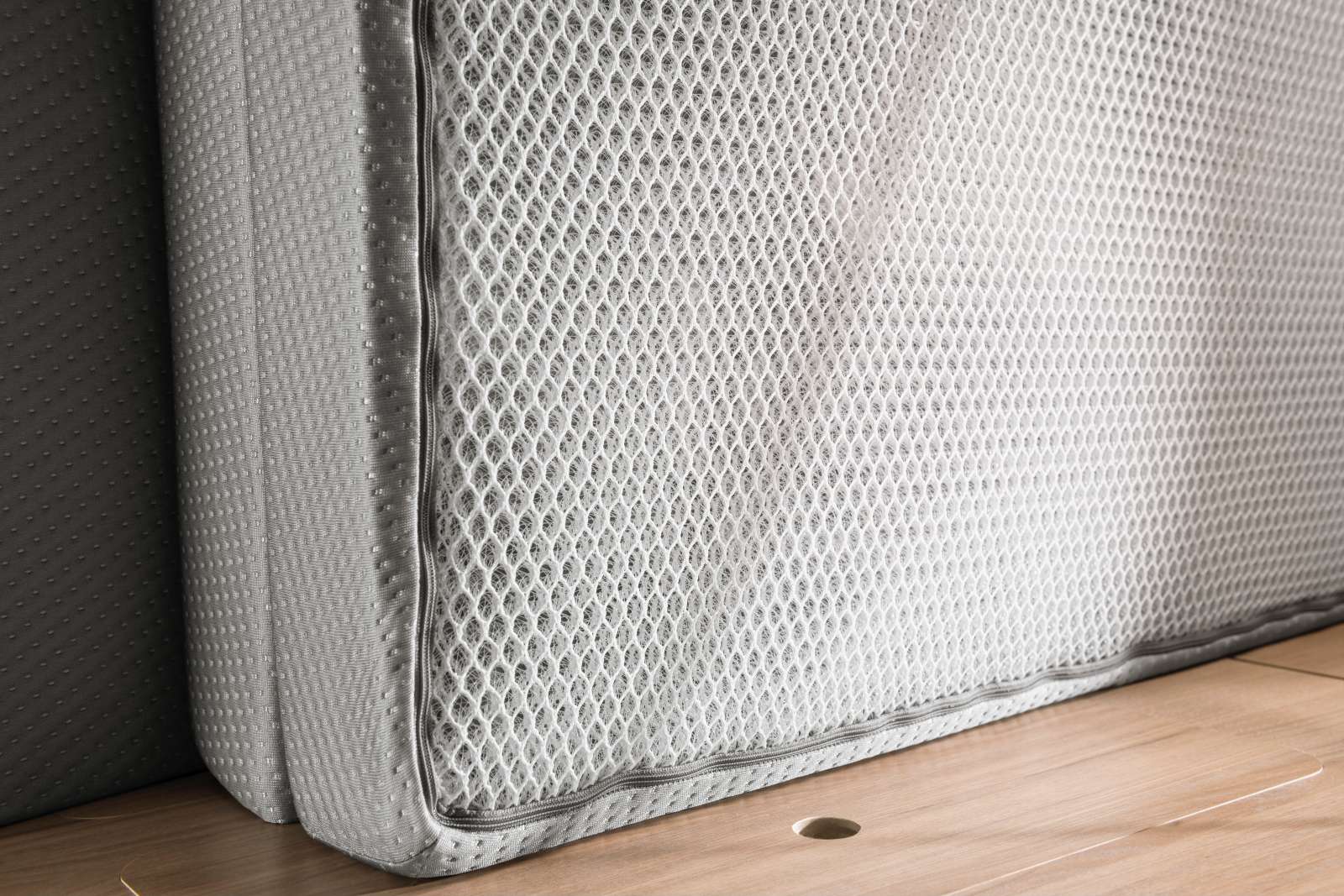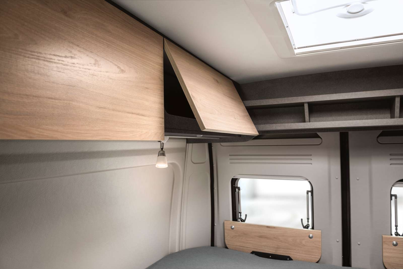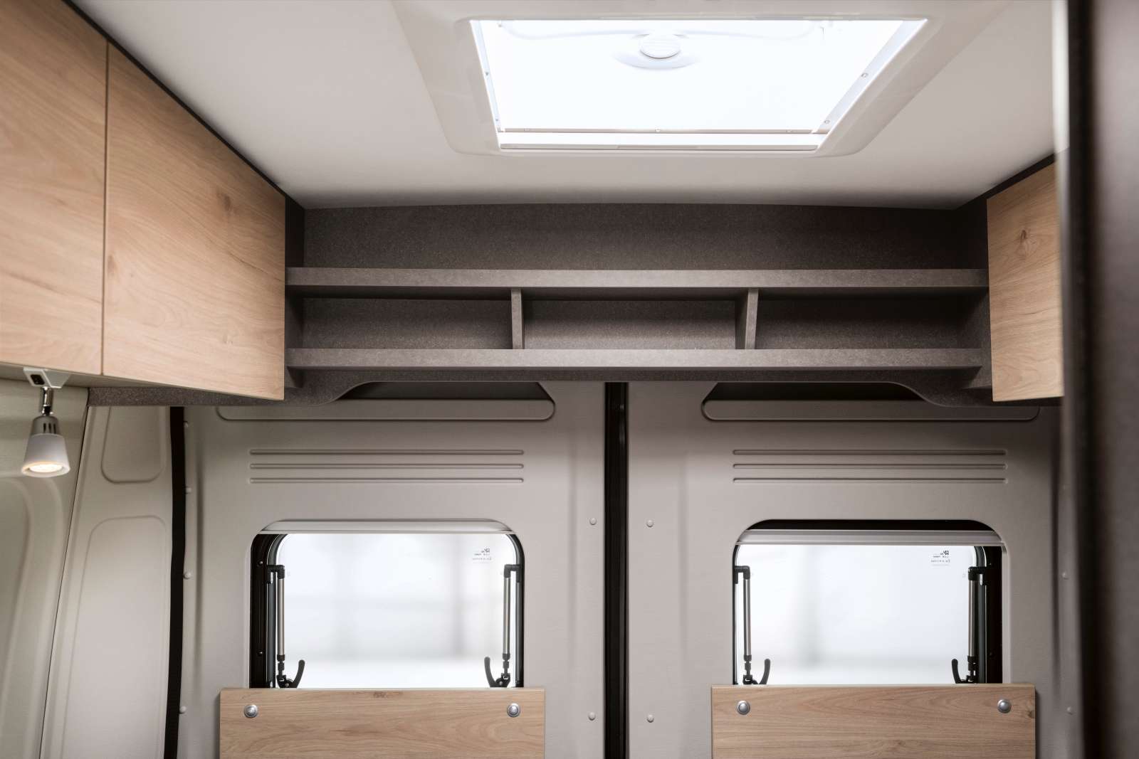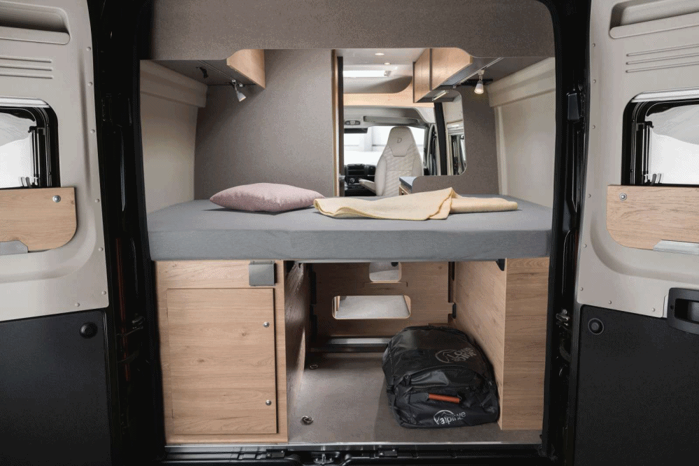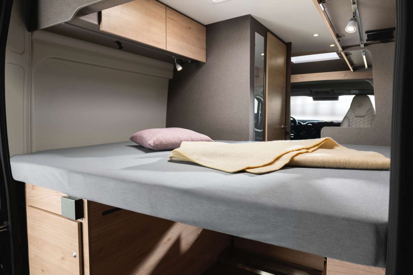 À l’arrière, le lit transversal double comprend un matelas à structure 3D respirante, favorisant le confort et aération. Sous le lit, le volume du coffre autorise le transport de matériel encombrant (vélos, équipements nautiques ou outdoor), après relevage du sommier et du matelas.