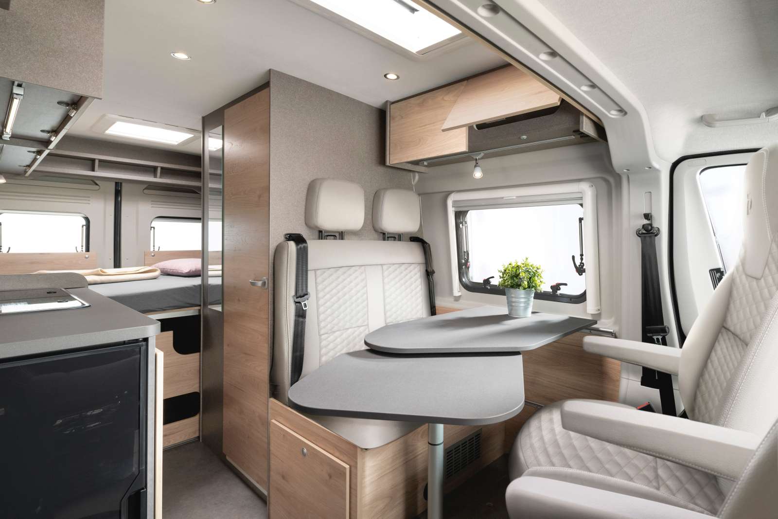 L’espace de vie adopte une configuration classique, mais optimisée. Le salon bénéficie de sièges avant pivotants, d’une sellerie spécifique matelassée et d’un éclairage LED d’ambiance. La table centrale, dotée d’une rallonge pivotante intégrée, permet d’adapter rapidement l’espace selon l’usage, tout en conservant une bonne circulation à bord.