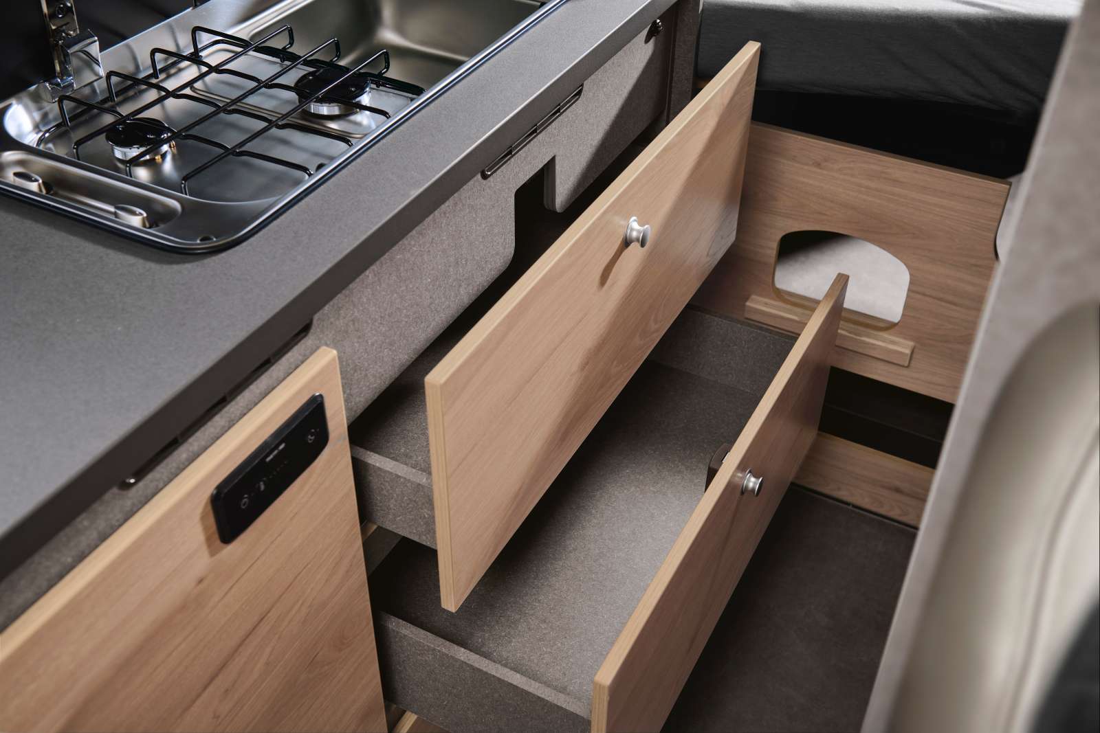 La cuisine se veut complète pour un véhicule de cette taille : réchaud gaz deux feux, évier avec alimentation en eau chaude, tiroirs de grand volume et plan de travail optimisé. Le réfrigérateur de 84 litres, accessible à la fois depuis l’intérieur et l’extérieur, constitue un atout pratique, notamment en usage extérieur ou en stationnement prolongé.