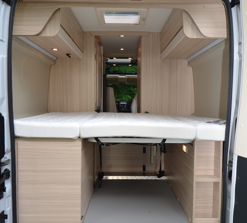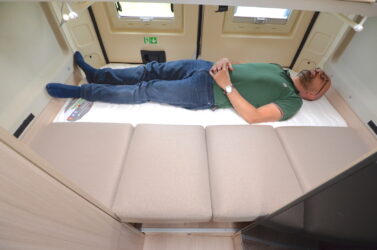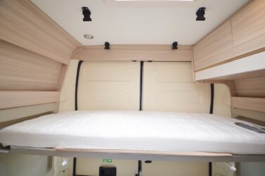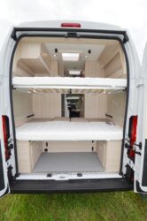 A la nuit tombée, ces deux espaces se transforment en chambre à coucher. Pour les parents, il suffit de déployer le lit de pavillon avant (190 x 130cm). Les enfants eux, disposent de deux lits superposés fixes (185/175 x 70 cm) blottis au fond du véhicule et d’un troisième couchage simple adjacent au lit bas, pouvant être obtenu par transformation de la dînette. C’est à dire après avoir extraie la table et mis en place le sommier déroulable et les coussins entre les deux sièges latéraux.