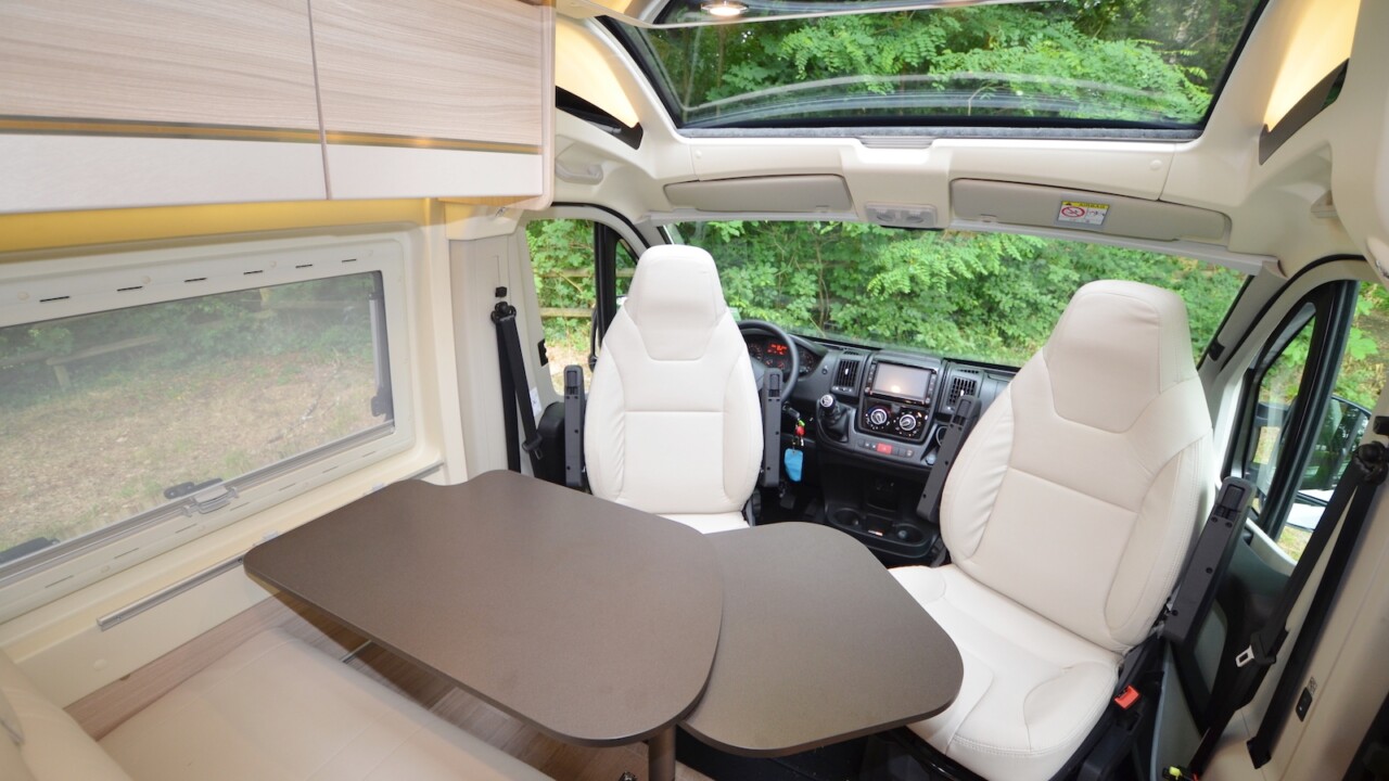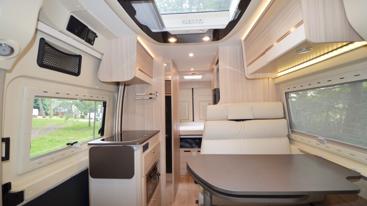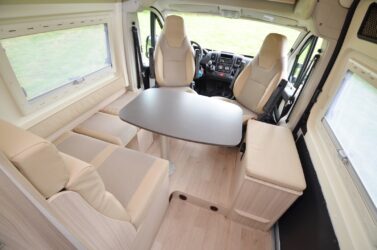 S’il n’est pas le seul fourgon aménagé à intégrer deux dînettes (voir par exemple le nouveau Living Van de Campérêve), le Camper Five n’en reste pas moins unique sur le marché. A l’étape, on profite d’un maxi-salon à l’avant pouvant accueillir jusqu’à 5 personnes et de deux banquettes face-face simples arrière.