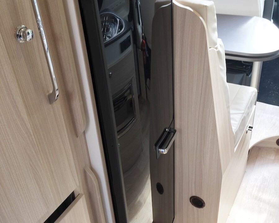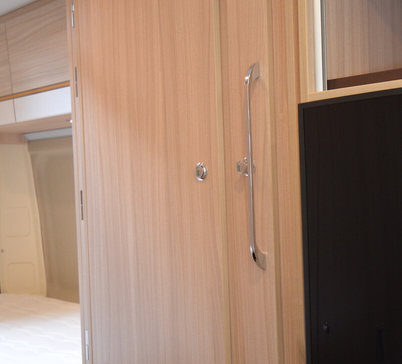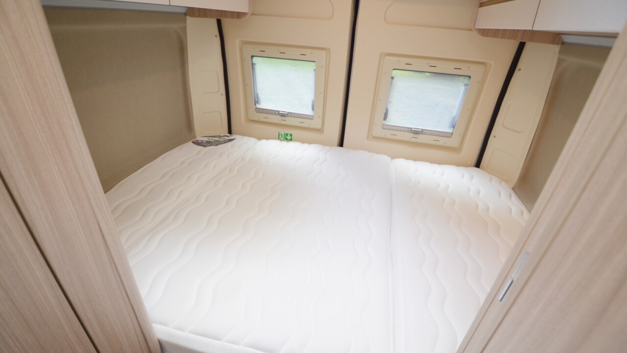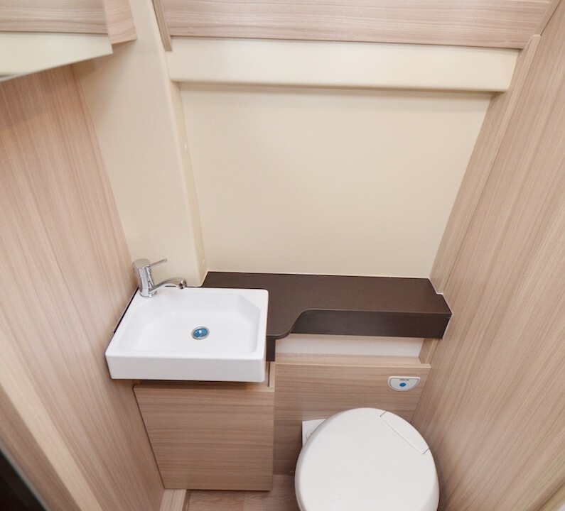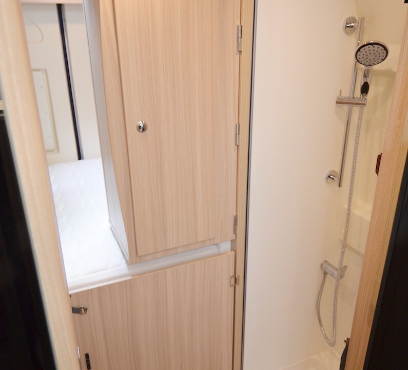 Modèle familial conçu pour 4 personnes, le D53 voit sa salle d’eau se dédoubler pour 2020, avec le cabinet de toilette et la douche installés désormais de part et d’autre du couloir. Un vrai luxe dans un fourgon 5,99m. Cette évolution importante permet au D53 d’accueillir l’ingénieuse penderie Modul’Space. Pour libérer la douche, il faudra ici retirer le lit haut et son sommier à peigne et faire pivoter la penderie côté chambre. Pour le reste, le D53 partage à présent le même plan que le D55 ; auquel il ajoute un lit double superposé arrière. A partir de 43 800€ en Fiat 120ch.