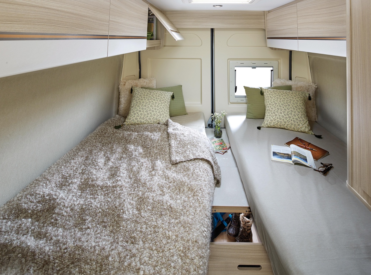 Sur Fiat Ducato L4H2, le D68 fait le choix de confortables lits séparés dans la longueur. Les couchages, dotés de matelas Bultex, proposent une surface respective de 195 cm et 193 cm de long sur 80 cm de large. Un kit matelas/sommier (en option) peut être intercalé au centre pour former un vaste couchage dans la longueur. Royal, non ? Côté rangements, on retrouve une offre diversifiée avec des placards de pavillon, une penderie en pied de lit, un tunnel à objet long et bien sûr, l’indispensable soute. Avant les départs en vacances, il suffira de relever les lits pour la transformer en garage à vélos !