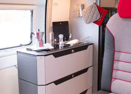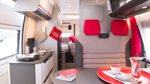 Avec six placards de pavillon en chambre, les rangements sont nombreux. À l’avant, on retrouve le nouveau bloc-cuisine et la nouvelle table de dînette de la collection 2018, au design plus anguleux.