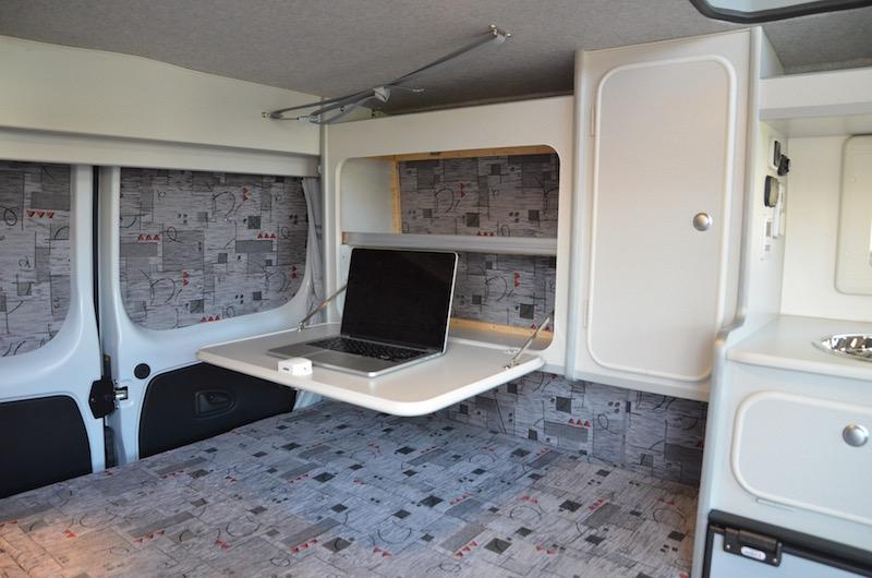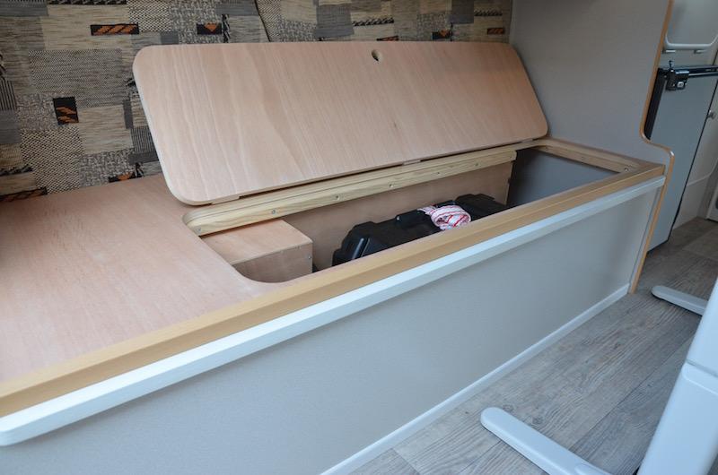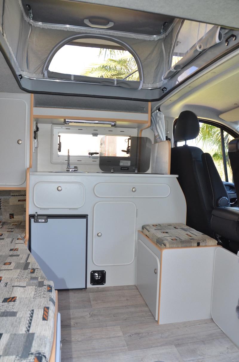 Libéré de la banquette, le schéma d’aménagement du Goéland laisse beaucoup de place. « Bien qu’on soit dans un petit véhicule mesurant moins de 5 m, il n’est pas nécessaire de replier systématiquement le lit pour prendre son petit-déjeuner ou ses repas. On peut le laisser à demeure. Dans un fourgon, je pars du principe qu’il faut éviter au maximum les manipulations quotidiennes ».