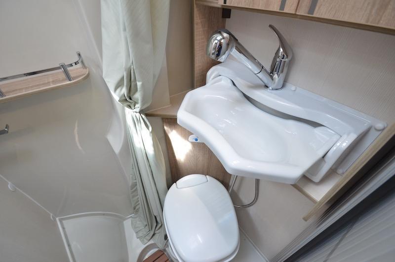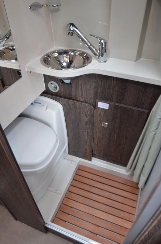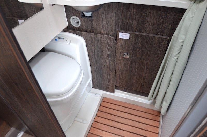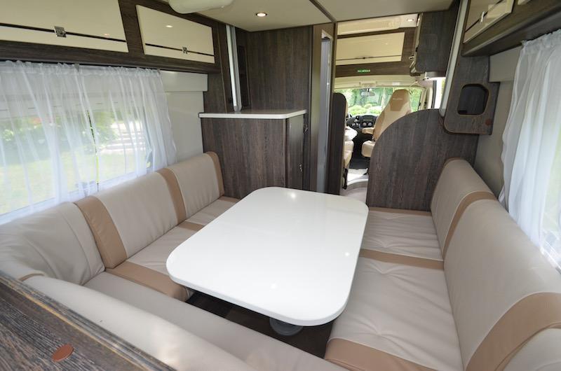 La partie centrale est occupée, d’un côté, par la cuisine (plaque deux feux, évier, réfrigérateur à compression de 90 litres et hotte aspirante) et, de l’autre, par la salle de bain avec lavabo, WC pivotant et douche. Les baies sont en double vitrage et tous les ouvrants disposent d’une moustiquaire, y compris au niveau de la porte latérale. Un marche-pied électrique ainsi que des pré-équipements TV et panneaux solaires sont proposés de série. La grande dînette arrière est particulièrement spacieuse et intègre de larges coffres de rangement. Pour permettre une grande autonomie, le Font Vendôme Plaisance D comprend deux batteries auxiliaires de 80 Ah, un réservoir d’eau propre de 100 litres (hors gel) et d’eaux usées de 100 litres également.
