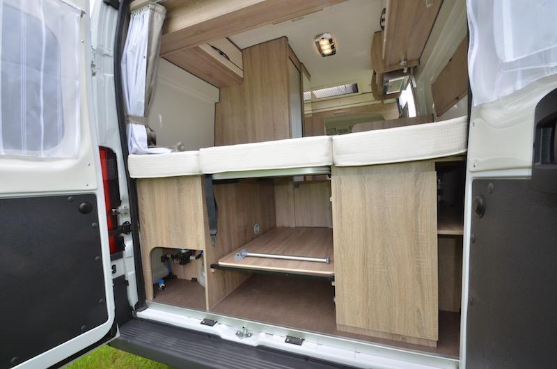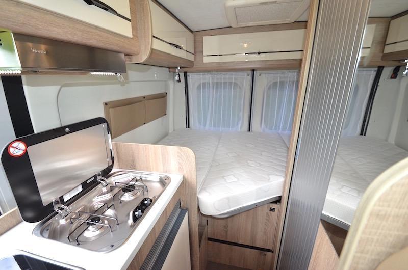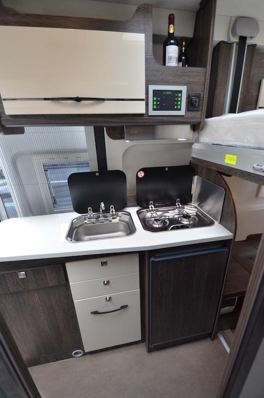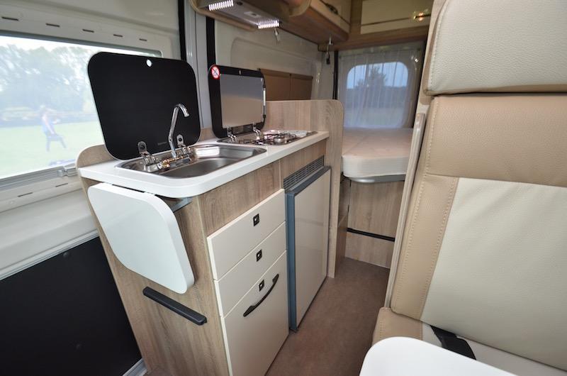 La cuisine deux feux gaz et évier est en face, côté droit du véhicule. Le Rando Van dispose aussi de pré-équipements TV et pour les panneaux solaires. Le chauffage et le chauffage de l’eau sont assurés par un Truma combiné D4. La circulation ne souffre pas de gros défaut et et la vie à bord s’annonce plaisante grâce à un large salon avant et un grand couchage à l’arrière. Prix : 41.490 €.