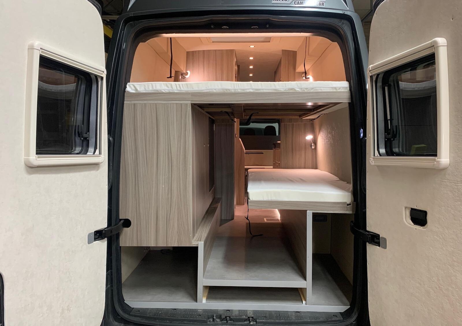 Jamais à court d’idées, Alpes Aménagement Camping-Car est capable de proposer des agencements complètement atypiques. A l’image de ce fourgon offrant 5 places carte grise et 5 couchages dans une configuration inédite. « Les parents voulaient pouvoir dormir à l’avant sur la banquette convertible, tandis que leurs trois filles dorment dans les lits double et simple à l’arrière, qui peuvent être relevés la journée pour laisser place à un couloir central« , nous expliquent Frédéric et Soazig Rio, les dirigeants d’Alpes Aménagement.