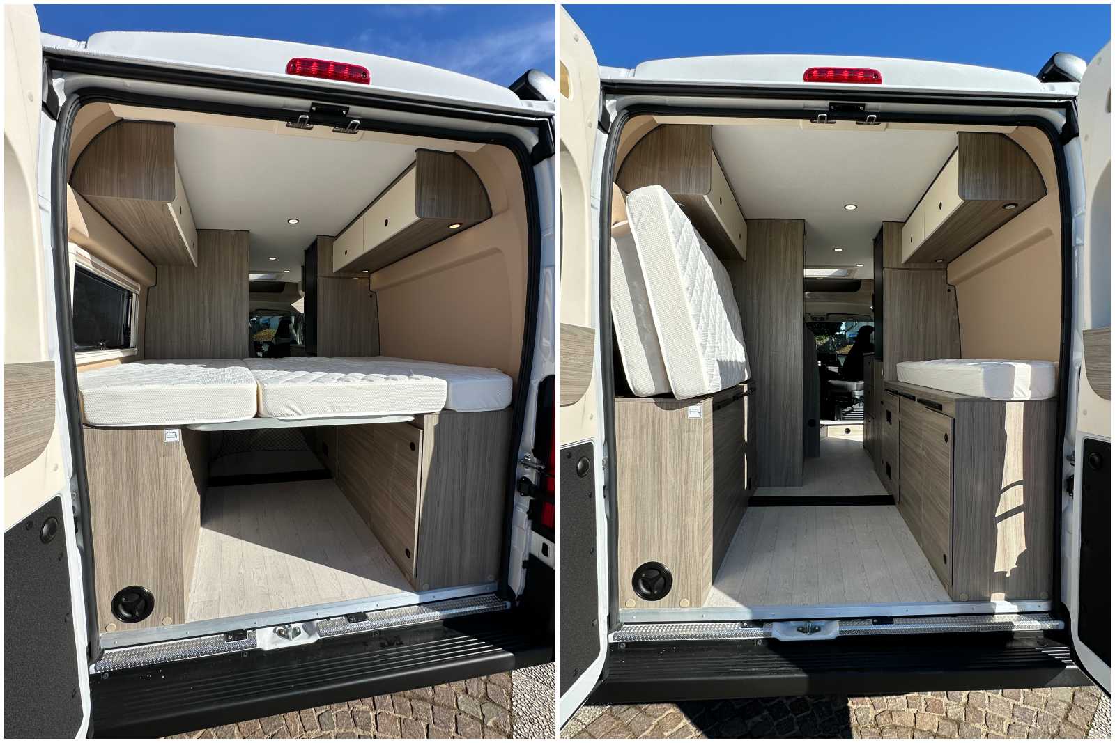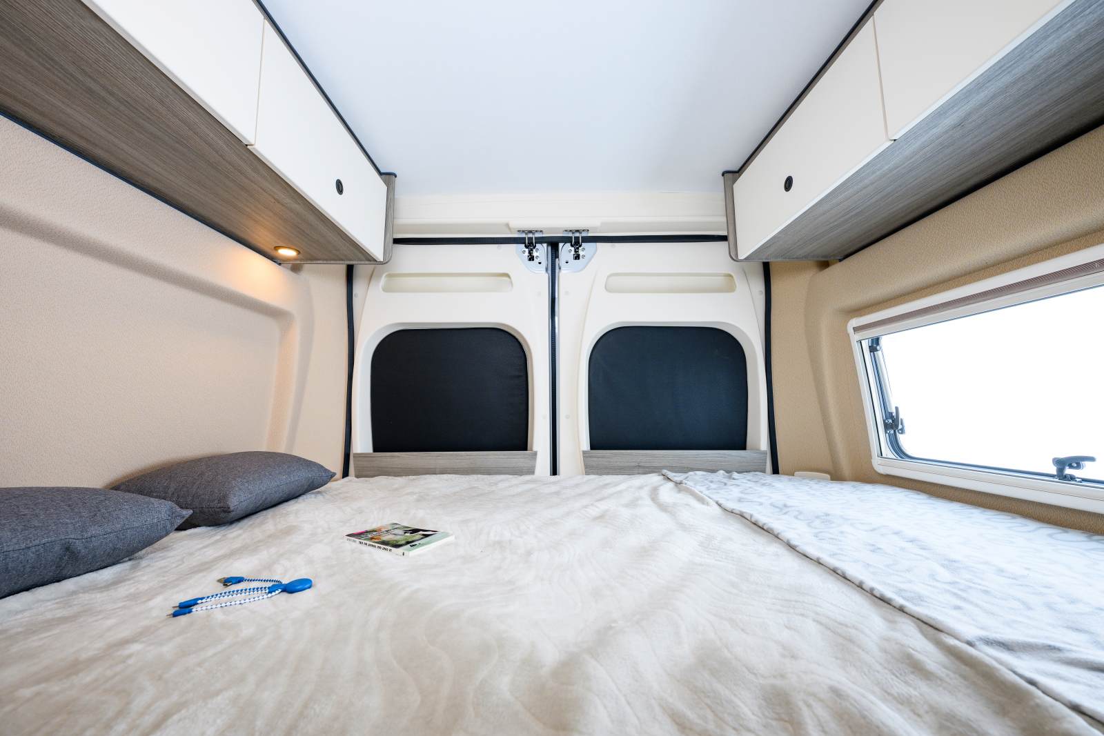 Confort toujours, à l’arrière du 602A, avec le confortable lit double sur sommier à lattes, dont la partie centrale est amovible pour libérer toute la hauteur de soute, afin de charger des vélos par exemple.