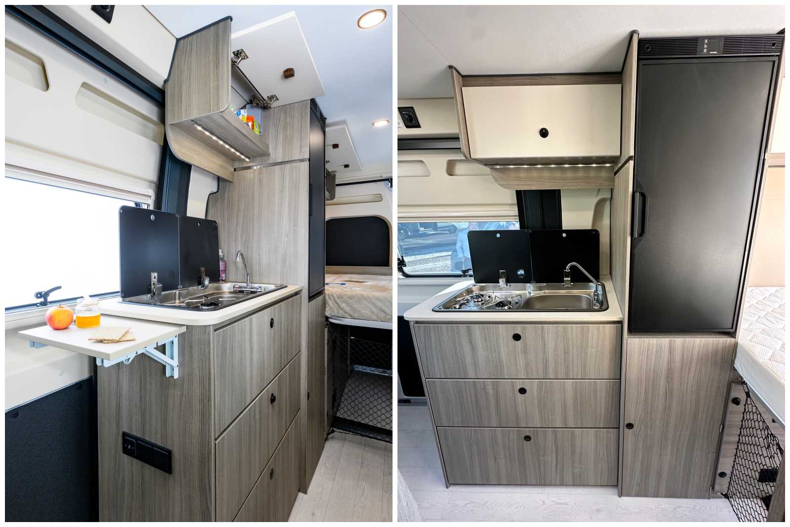 Le bloc cuisine se compose d’un réchaud deux feux au gaz et d’un évier, dotés de couvercles en verre rabattables, ainsi que d’une extension du plan de travail et de larges tiroirs. Côté droit, se trouve le réfrigérateur à compression de 110 L, au-dessus d’une très pratique penderie.