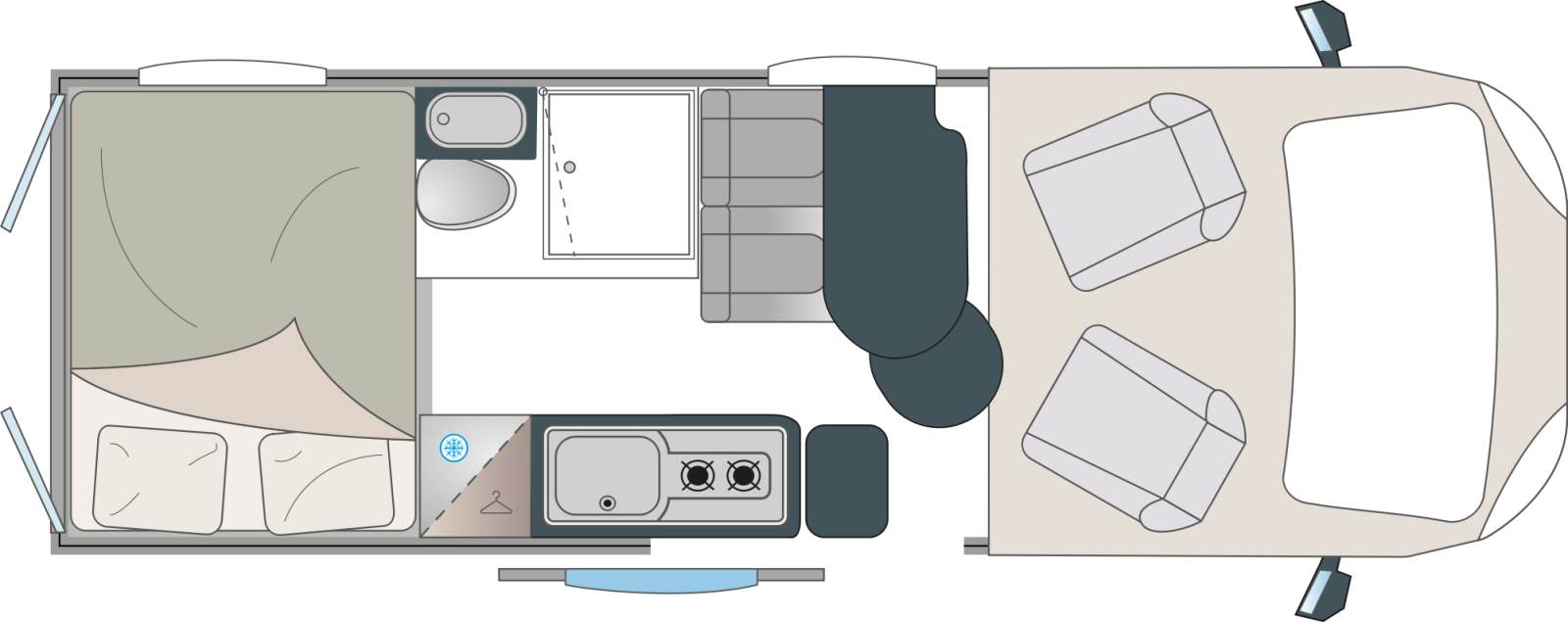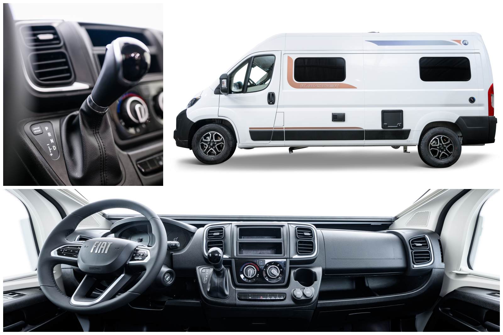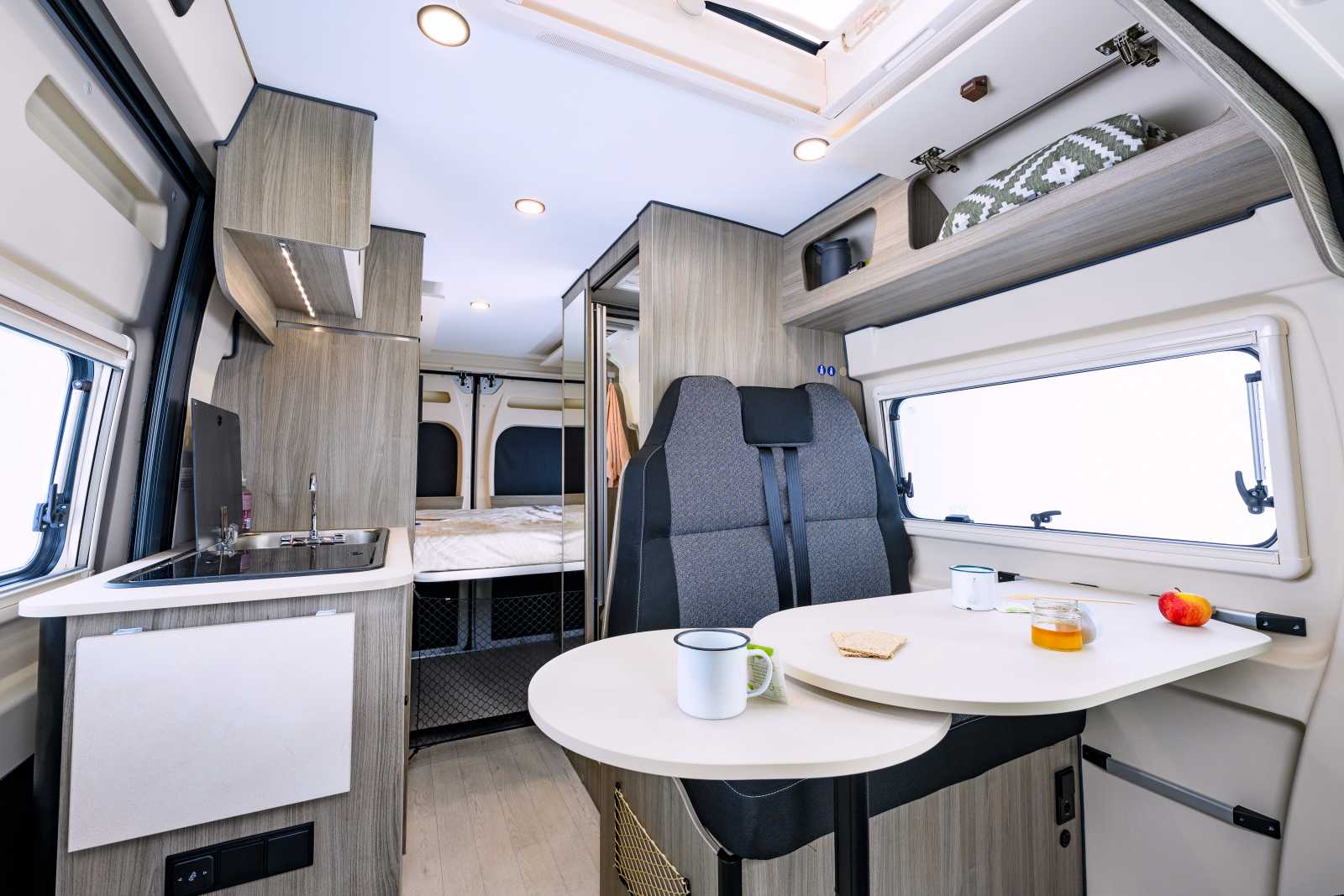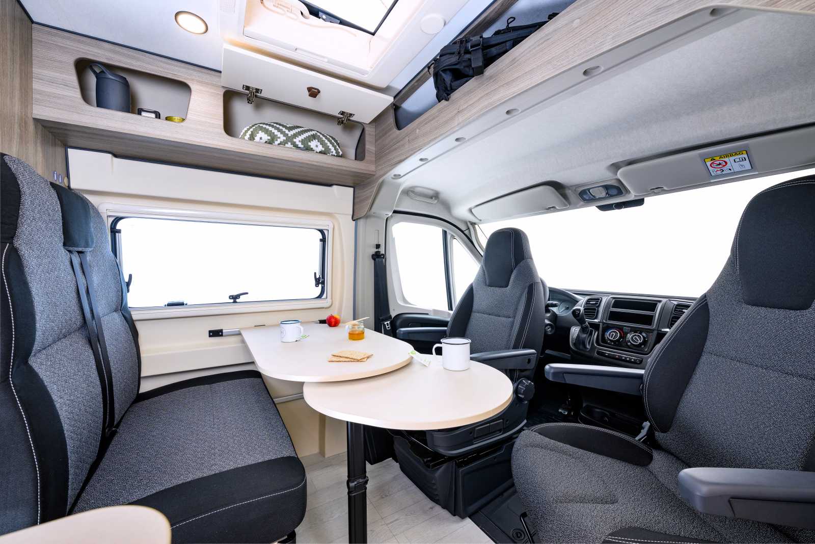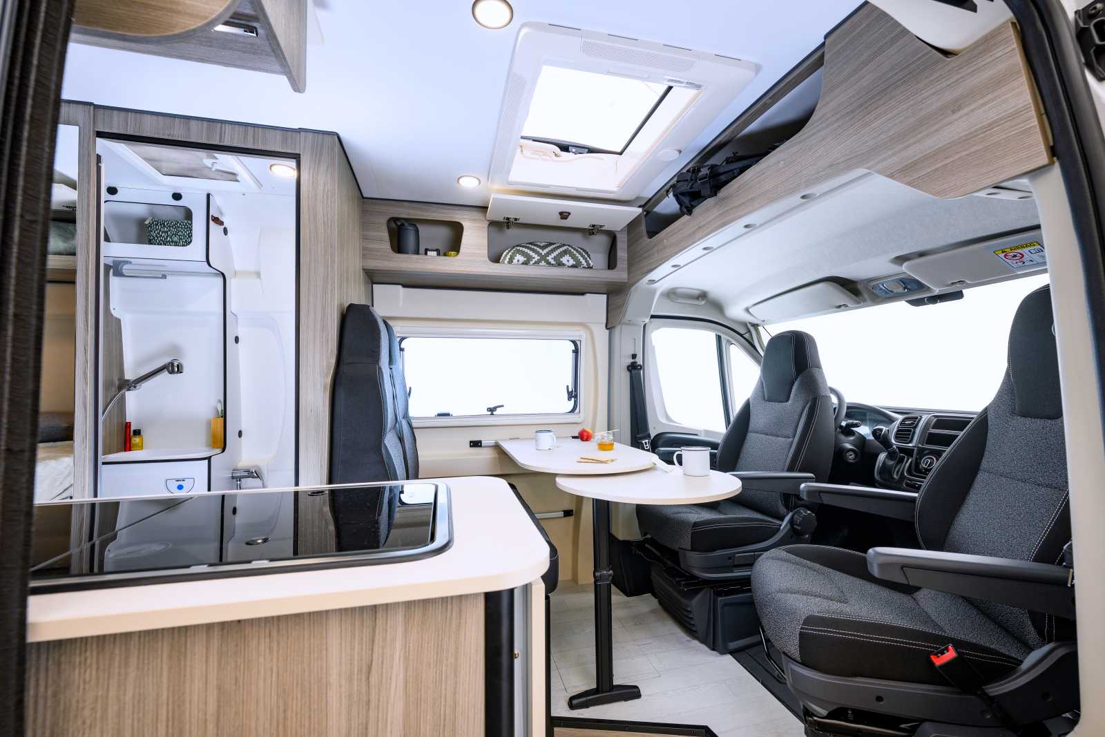 Équipements de série : jantes alu 16’’, suspensions arrière renforcées, climatisation cabine, régulateur et limiteur de vitesse, volant et pommeau de levier de vitesse en cuir, commandes radio au volant avec antenne radio DAB, Traction + sièges avant pivotants Captain Chairs, vitres et rétroviseurs à commande numérique, verrouillage centralisé, banquette arrière 2 places Isofix, rallonge de table, rangement de cabine, combiné chauffage/chauffe-eau Truma D4, réfrigérateur à compression 110 L, salle d’eau avec paroi accordéon pour isoler la douche, grande penderie, moustiquaire de porte latérale, stores plissés en cabine, panneau solaire 130W, store extérieur, baies à double vitrage teintées Seitz S7P, marchepied électrique, éclairage extérieur + gouttière sur porte latérale, etc.