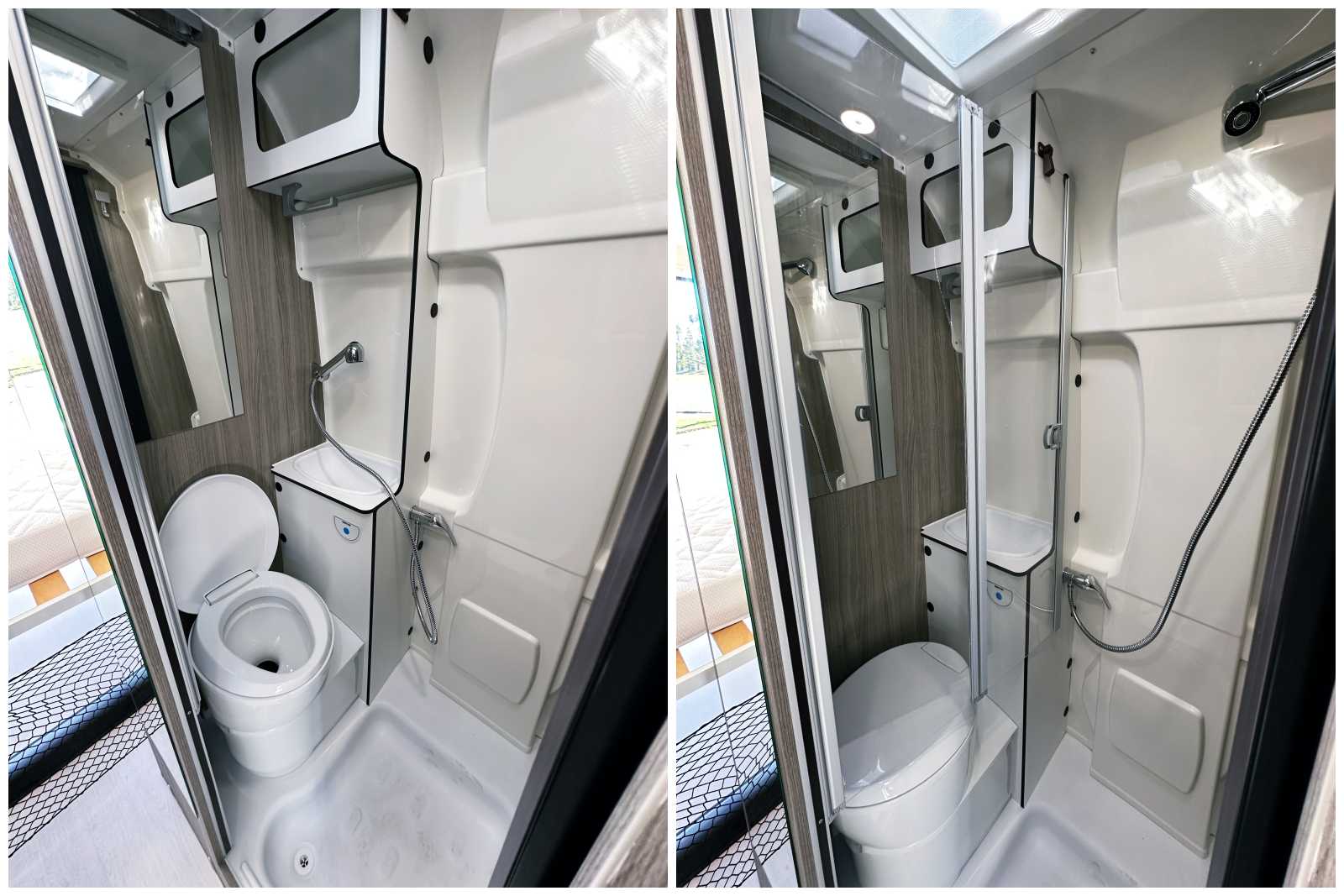 Le confort est de mise à bord du 602A, à l’image de la salle d’eau réinventée par Randger. L’aménageur opte pour une salle de bains 3-en-1, baptisée TB Concept. Une paroi de douche pliante transparente permet d’isoler la douche de la partie latérale, où l’on retrouve le WC, un grand miroir mural, un lavabo d’angle et un rangement de pavillon.
