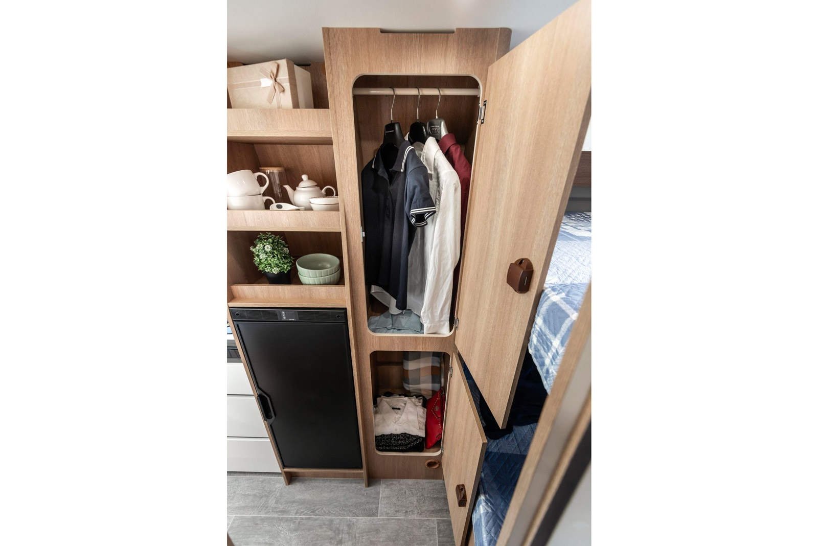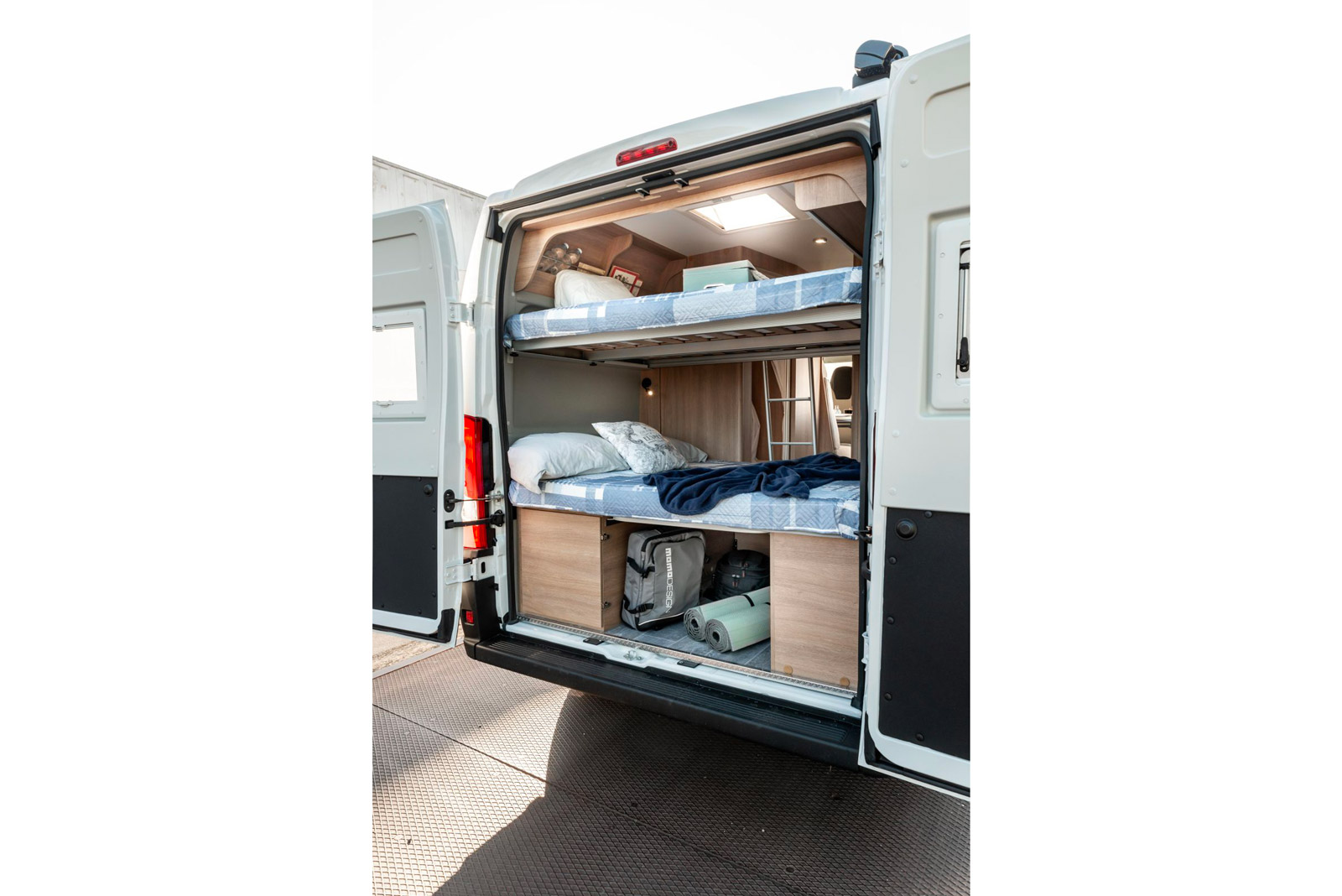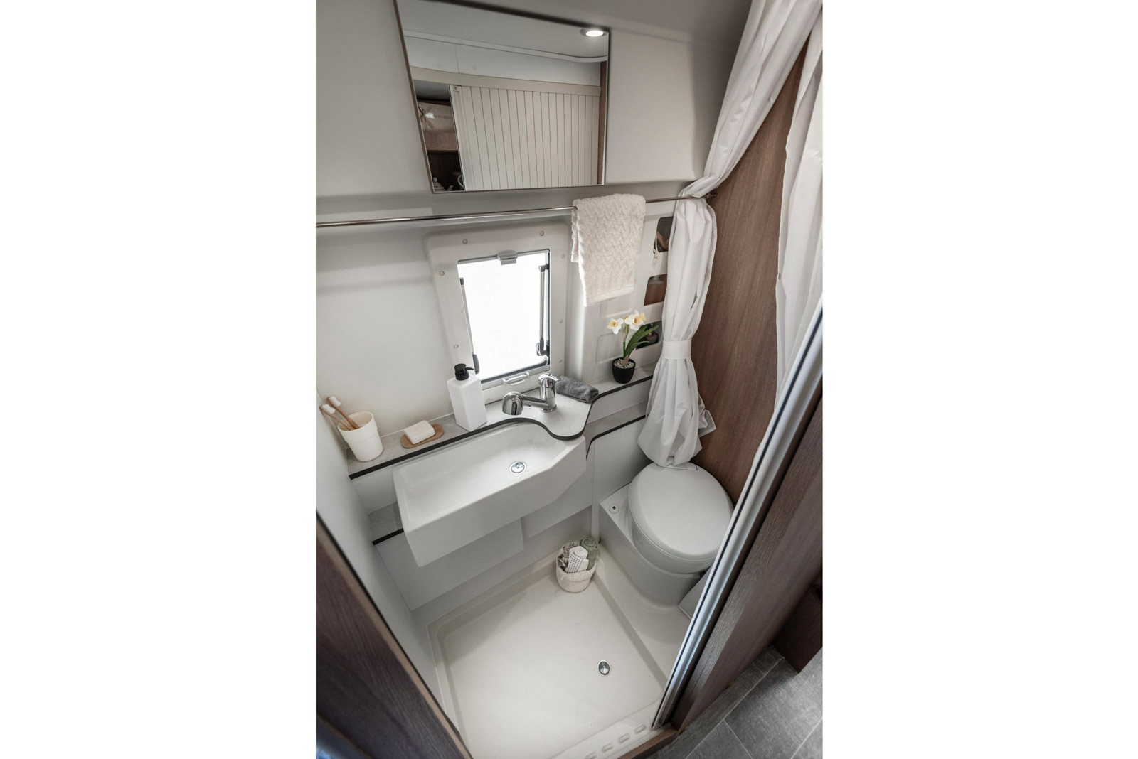 Du Giottivan 60B au 60 BE YOUNG, l’implantation reste la même. Sur une longueur de 5,99 m, on retrouve des lits doubles transversaux à l’arrière, une dînette 4 places et un cabinet de toilette 3-en-1 doté d’un lavabo pivotant.