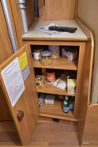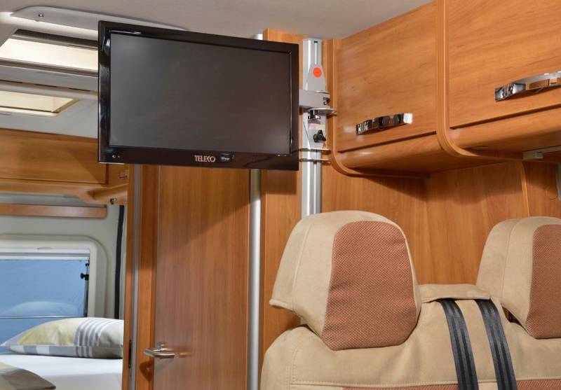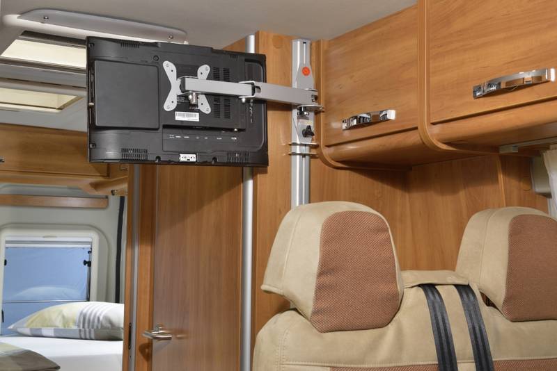 A l’inverse des modèles précités, l’espace derrière la banquette face-route reçoit ici – non pas un réfrigérateur 142L, Globecar préférant en intégrer un plus compact (65L. + freezer 10L.) dans le module cuisine – mais un meuble de rangements. Qui servira accessoirement de plan pour déposer clés, magazines et autres effets personnels. Bon point également pour le système (optionnel) de support TV, coulissant sur un rail vertical, et qui permettra – grâce à son bras articulé – de regarder la télévision depuis le lit arrière comme depuis la dînette.