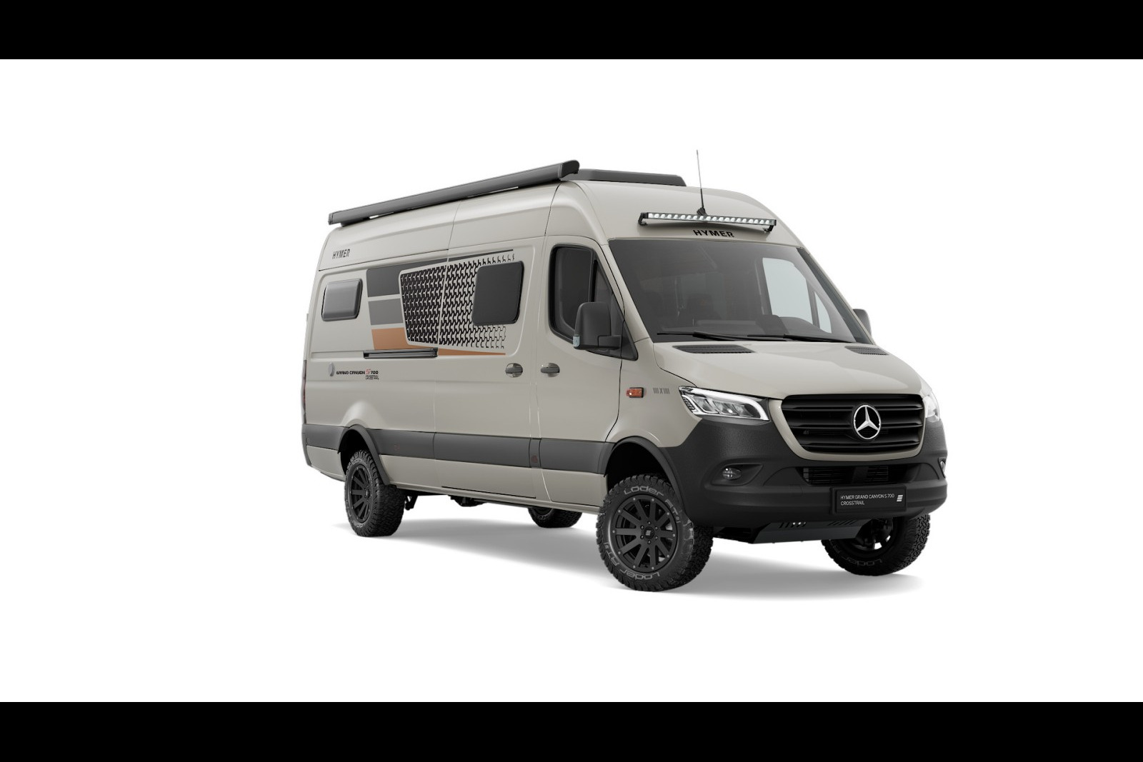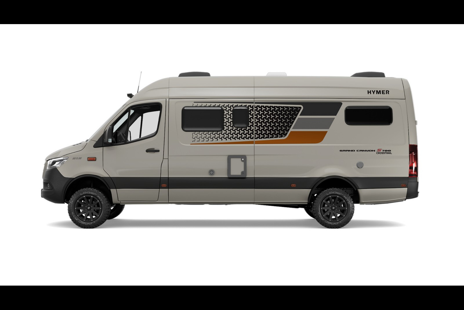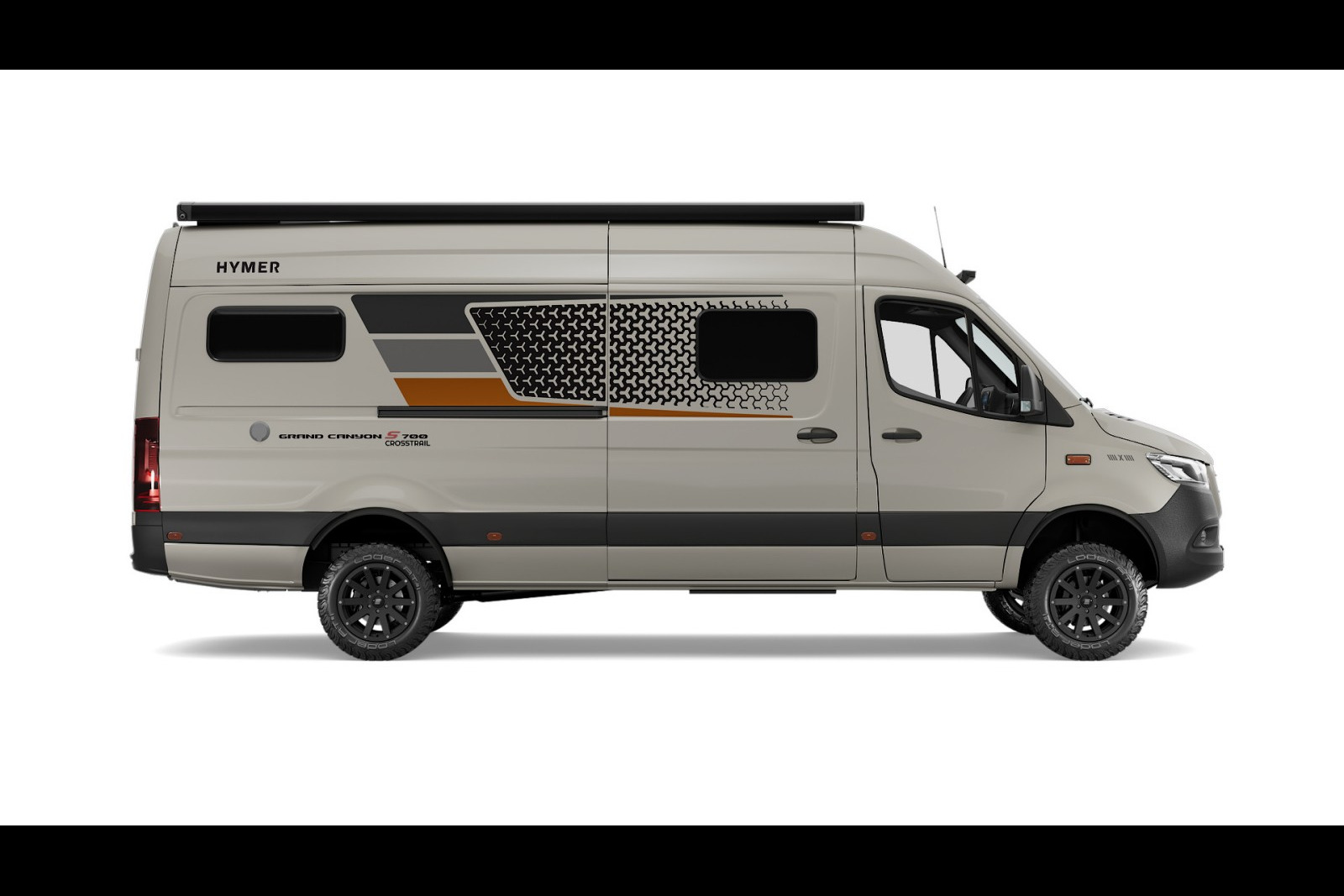 Surfant sur le succès de la série spéciale CrossTrail proposée sur le profilé ML-T 580 en début de saison, Hymer reprend la même formule et l’applique au Grand Canyon S 700. Un camper-van haut de gamme sur Mercedes Sprinter, décliné d’entrée en version 419 CDI (4100 kg de PTAC), avec transmission 4×4, motorisation 190 ch et boite de vitesses automatique. Par rapport au modèle classique, cette version CrossTrail offre un look extérieur au caractère offroad plus affirmé. La carrosserie associe d’abord une peinture gris sable (Stone Grey) et une élégante sérigraphie.