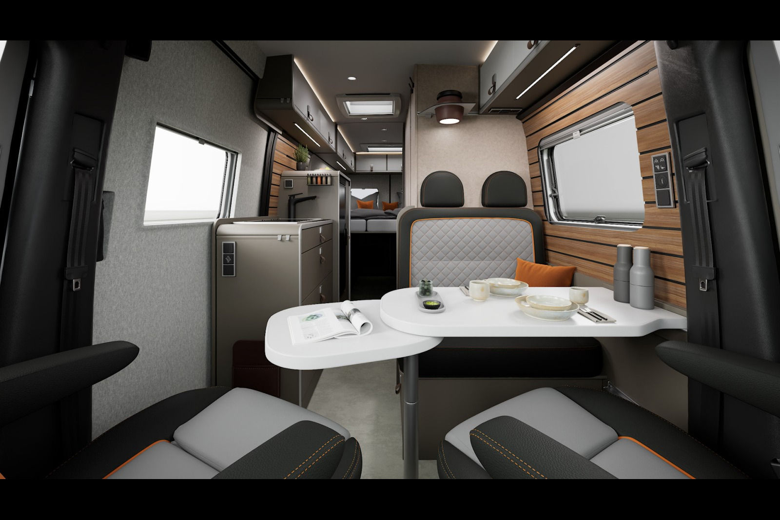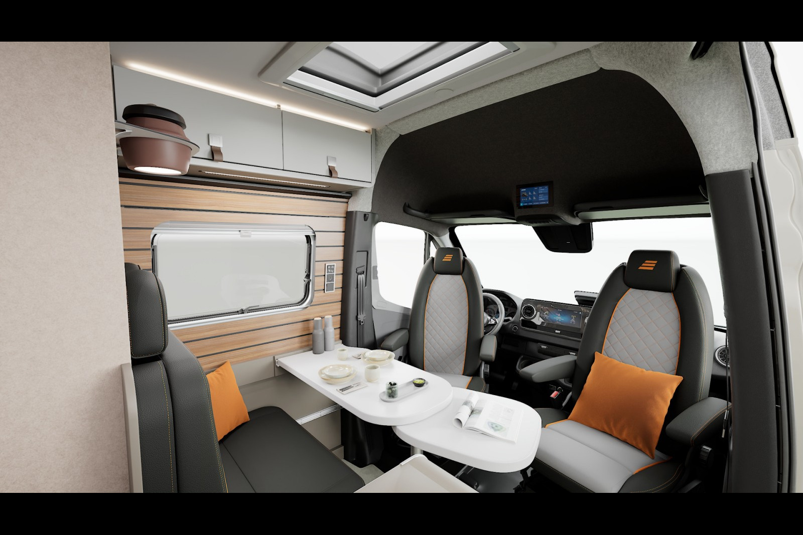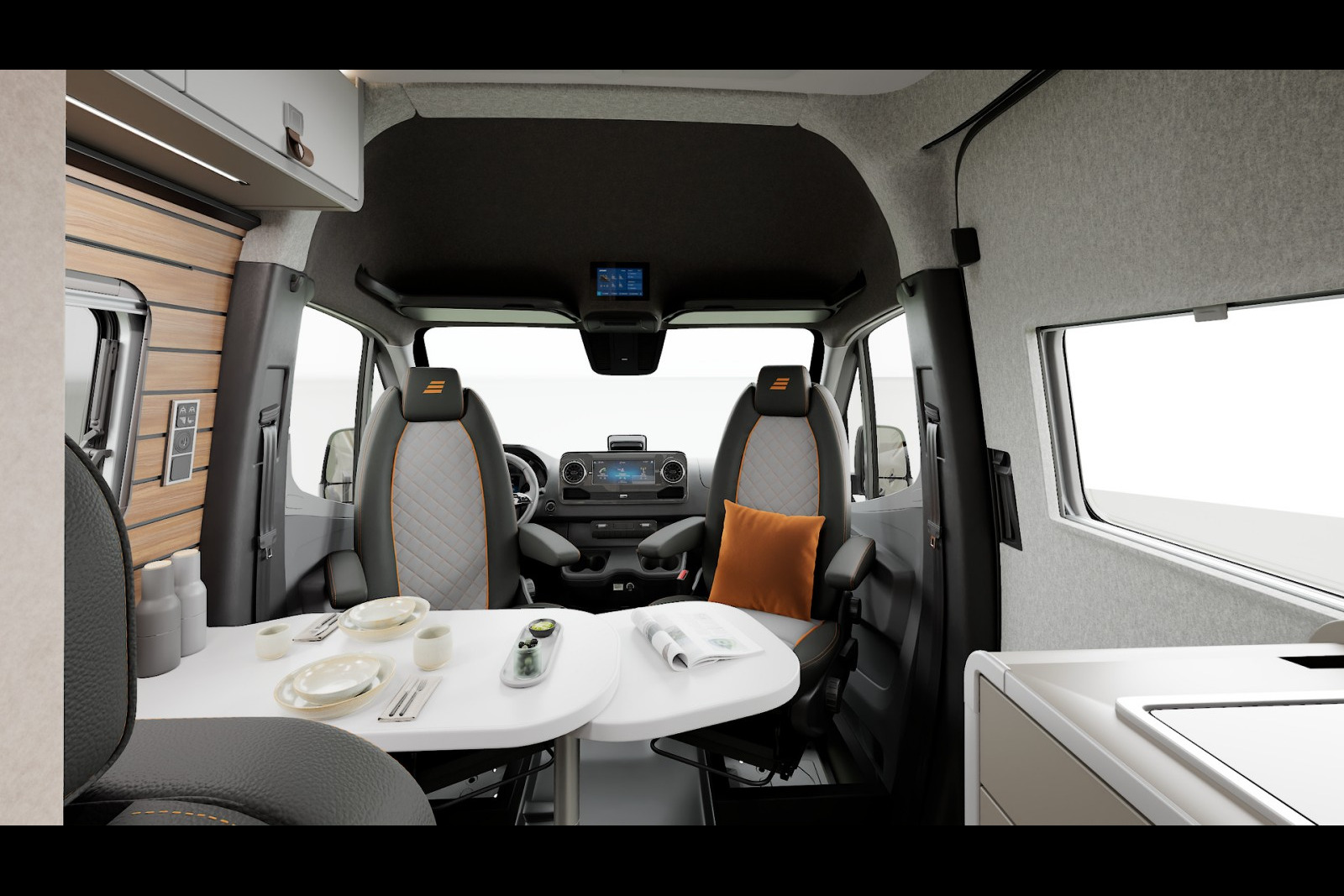 A bord, Hymer s’inspire du design automobile avec la très sportive sellerie cuir « Tallinn », arborant des surpiqûres orange et des motifs matelassés. Le Grand Canyon S 700 gagne dans cette édition de nombreuses fonctionnalités de série : routeur 5G avec antenne sur le toit pour disposer d’une connexion Internet ultra-rapide, filtre pour le circuit d’eau propre, deuxième cassette de toilette, etc.