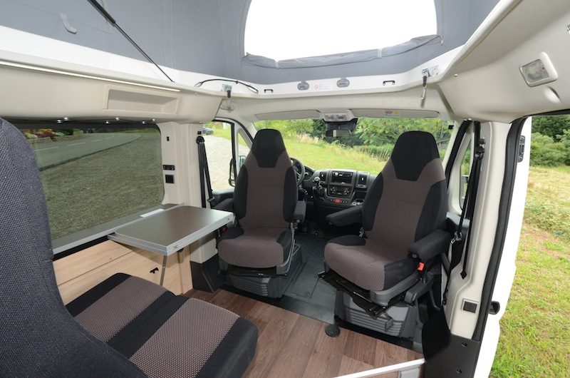 Il est important de préciser, avant de rentrer dans le détail des gammes, que l’ensemble des modèles HYMERCAR sont disponibles en cinq places carte grise ! Un avantage pas si fréquent. Libre à vous de les exploiter en ajoutant un ou deux fauteuils en option. Les modèles LIFE sont livrés de série avec trois places assises, deux en cabine, et une à l’arrière, à hauteur de la dînette. Ce fauteuil présente la particularité d’être réglable et inclinable, gage d’un confort supérieur. Plus classique la banquette deux places de la gamme PRO n’offre pas cette disposition.